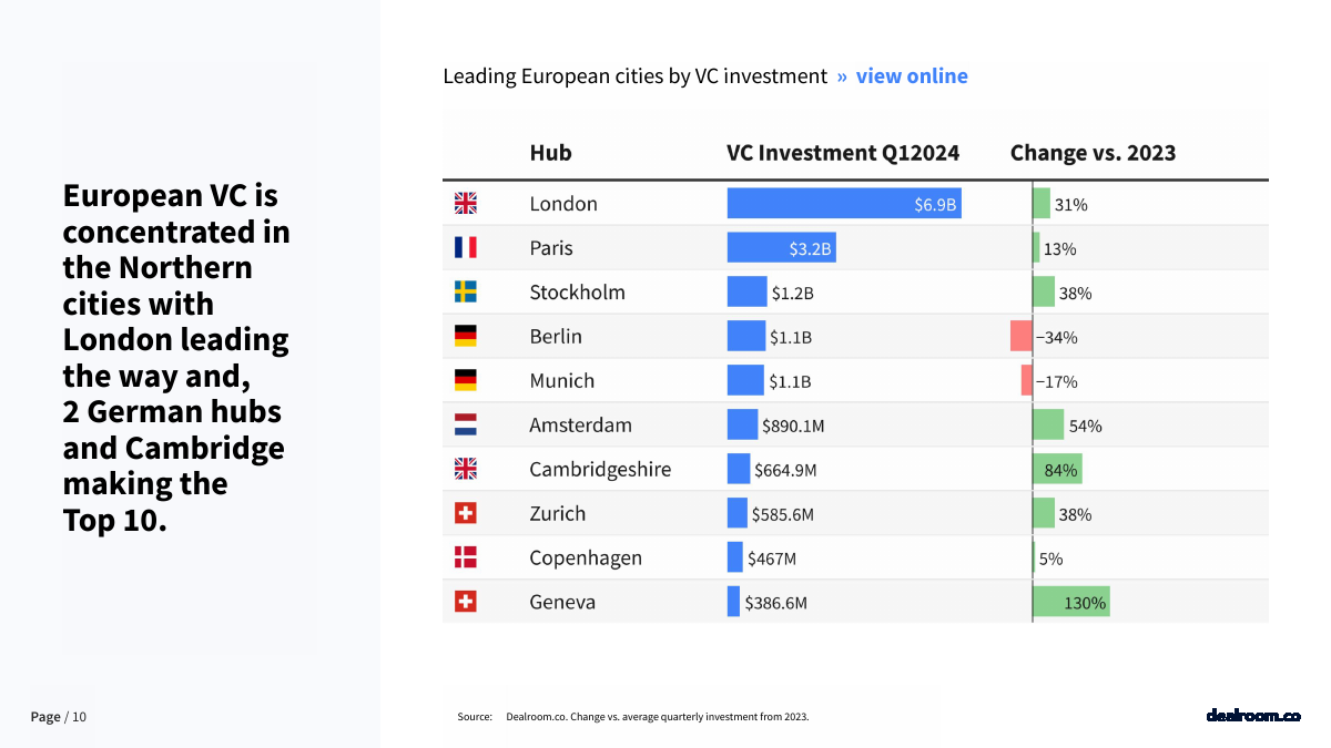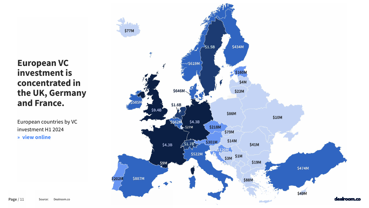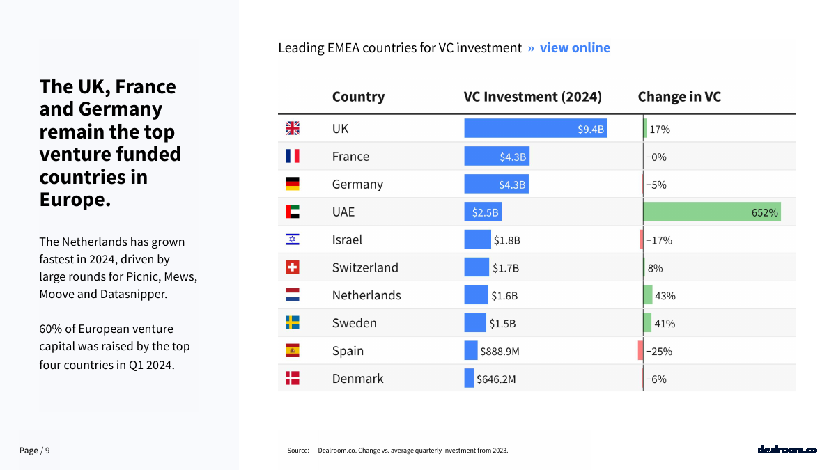 2024年第一季度,欧洲60%的风险投资是由排名前四的国家获得的。