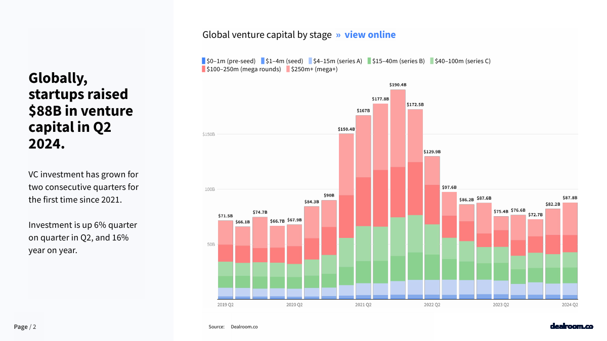 在全球范围内,创业公司在2024年第二季度获得了880亿美元的风险资本。