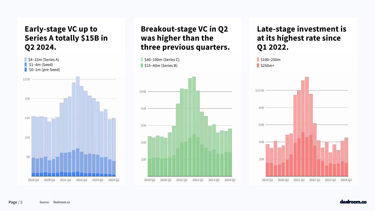2024年第二季度,A轮投资的早期风险投资总额为150亿美元。