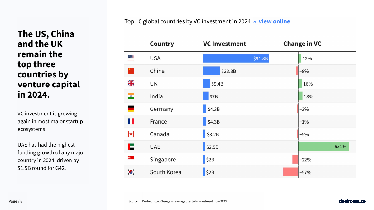 2024年,美国、中国和英国仍是风险投资最多的三个国家。