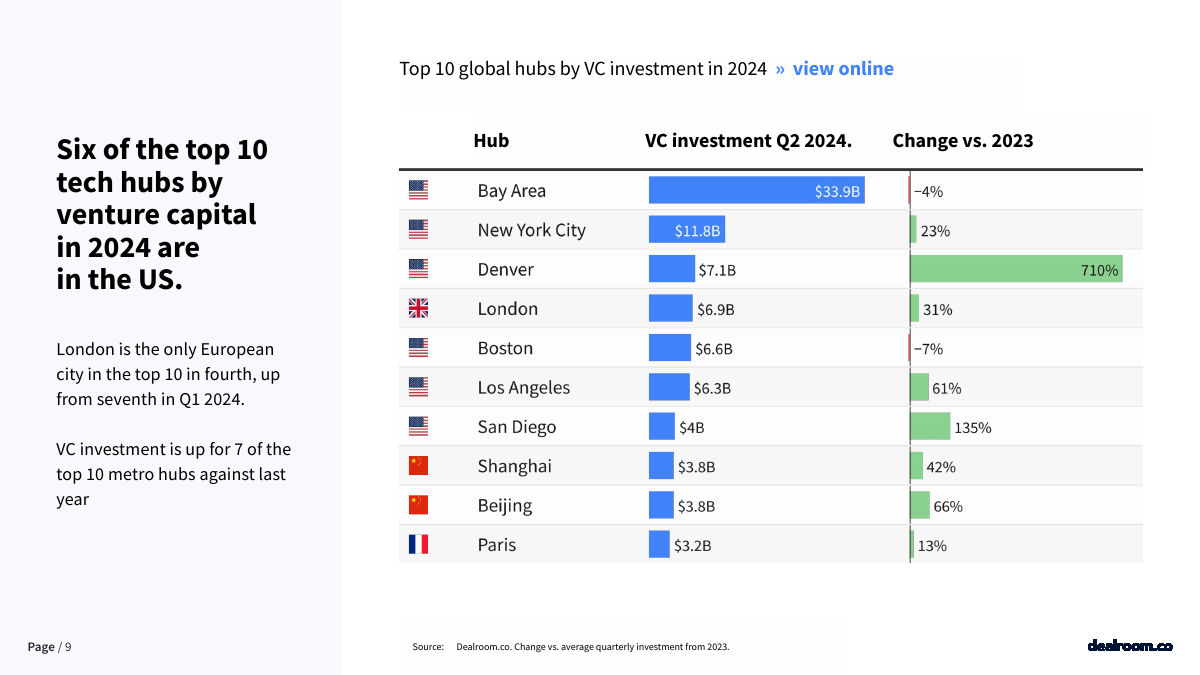 2024年风险投资排名前10的科技中心中有6个在美国。