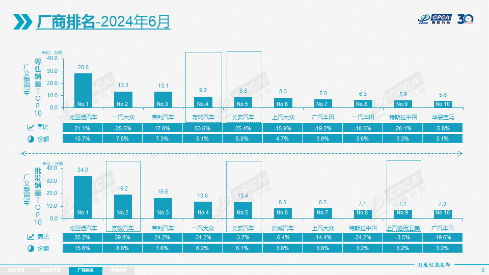 4)车企:6月新能源乘用车企业总体走势较强,比亚迪纯电动与插混双驱动夯实自主品牌新能源领先地位;以赛力斯汽车、理想汽车、长安汽车、零跑汽车等为代表的增程式电动车表现尤其突出。在产品投放方面,随着自主车企在新能源路线上的“多线并举”策略的实施,市场基盘持续扩大,厂商新能源月度批发销量突破万辆的厂商达到19家(同比增加6家,环比增加3家),占新能源乘用车总量90.4%(上月88.8%,去年同期82.7%)。其中,比亚迪:340,211辆、特斯拉中国:71,007辆、吉利汽车:65,959辆、长安汽车:53,827辆、理想汽车:47,774辆、赛力斯:43,850辆、上汽通用五菱:42,244辆、奇瑞汽车:39,764辆、长城汽车:26,034辆、广汽埃安:25,692辆、蔚来汽车:21,209辆、东风汽车:20,572辆、零跑汽车:20,116辆、小米汽车:14,296辆、华晨宝马:12,827辆、小鹏汽车:12,508辆、一汽红旗:11,402辆、上汽乘用车:10,944辆、上汽大众:10,373辆。