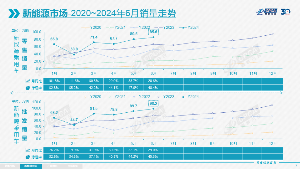 6月新能源车市场零售85.6万辆,同比增长28.6%,环比增长6.4%。2024年1-6月零售411.1万辆,同比增长33.1%。