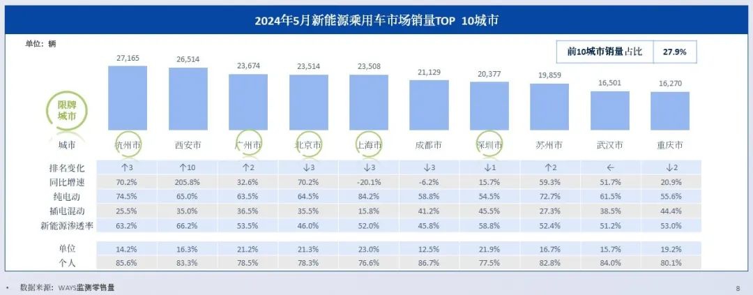 - 分燃料类型看,TOP 10城市销量均以纯电动居多;从产权归属看,以个人用户居多。