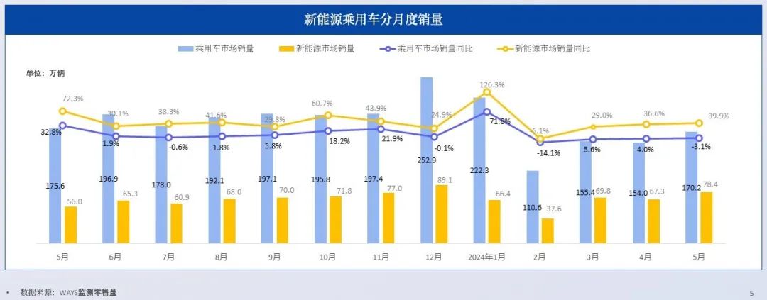 - 5月,乘用车市场销量为170.2万辆,同比下降3.1%,连续4个月下滑;新能源市场销量约为78.4万辆,同比上涨39.9%,表现明显优于整体市场。