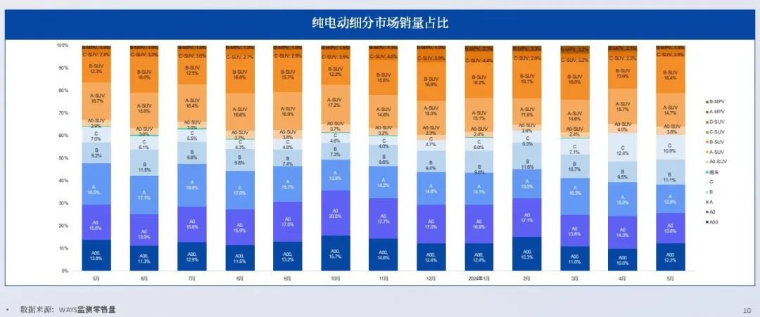 5月,纯电动TOP 3细分市场分别是: B-SUV(16.4%)、A-SUV(14.7%)和A0(13.6%)。跟上月相比,B-SUV和A00级市场份额上升相对较多(+2.5%、+2.2%),主要由MODEL Y(国产)和宏光MINI EV带动细分市场增长;A级市场份额相对下降较多(-2.4%)。 - 相比去年同期,A级市场份额从18.5%增至12.6%。