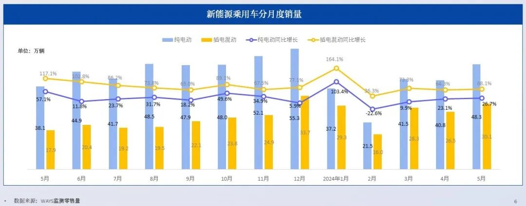 - 5月,纯电动销量约48.3万辆,同比上涨26.7%,环比上涨18.3%;插电混动销量约30.1万辆,同比上涨68.1%,环比上涨13.7%。