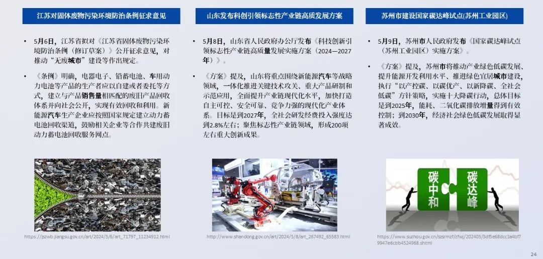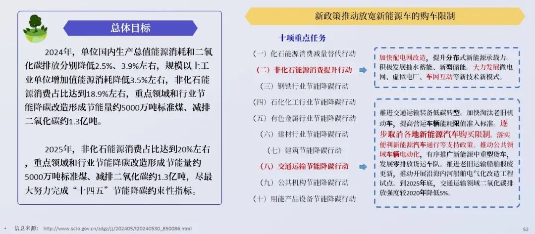 - 5月29日,国务院印发《2024-2025年节能降碳行动方案》。《方案》共提出十大项重点行动、27条重点任务,其中非化石能源消费提升行动和交通运输节能降碳行动均对新能源汽车行业发展提供了助力。