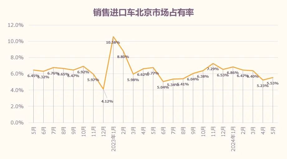 - 5月北京进口车销量占北京新车交易总量5.53%,占有率环比增长0.3个百分点,同比下降1.24个百分点。