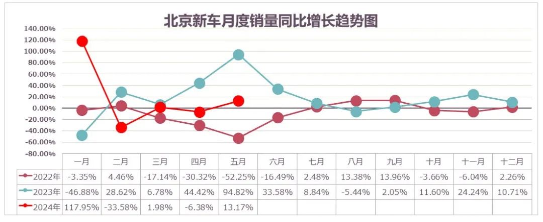 - 1—5月北京累计交易新车25.37万辆,同比去年23.04万辆累计增长10.11%,增幅高于全国1.81个百分点。