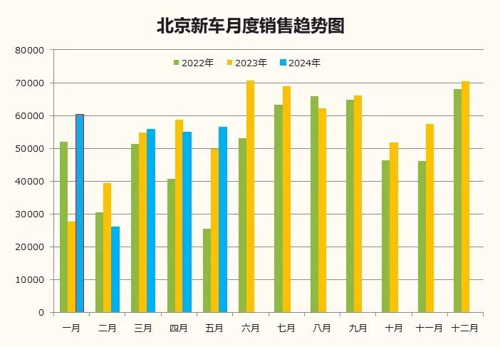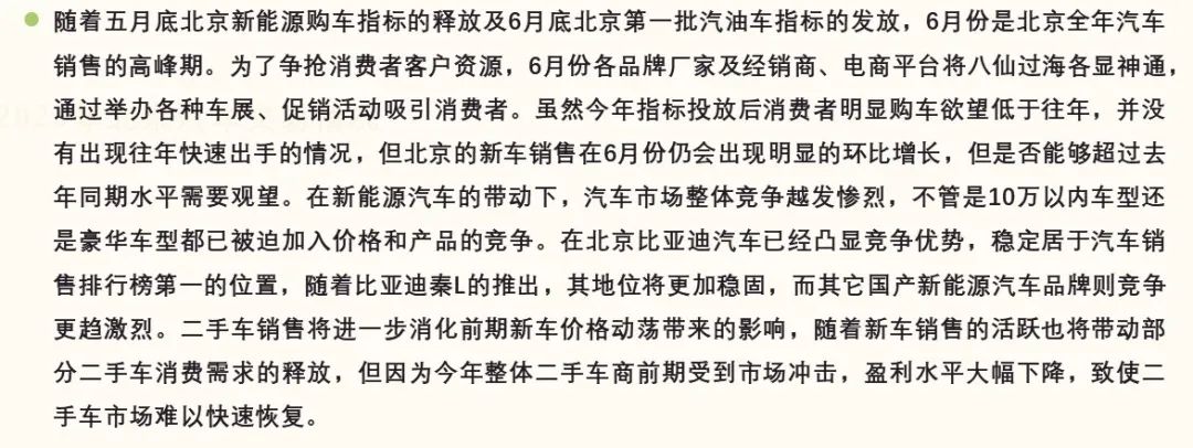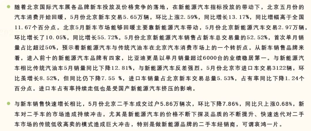 - 5月份北京新车交易5.65万辆,环比上涨2.59%,环比增幅高于全国0.09个百分点;同比增长13.17%,同比增幅高于全国11.67个百分点。