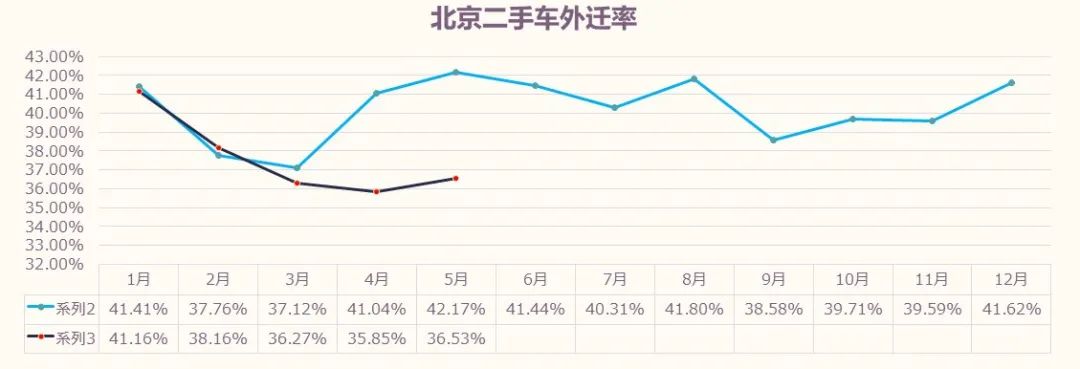 5月份北京二手车交易外迁率为36.53%,外迁率环比增长0.68个百分点,同比下降5.64百分点,1-5月北京二手车外迁率为37.49%,累计外迁10.07万辆,同比下降9.42%。