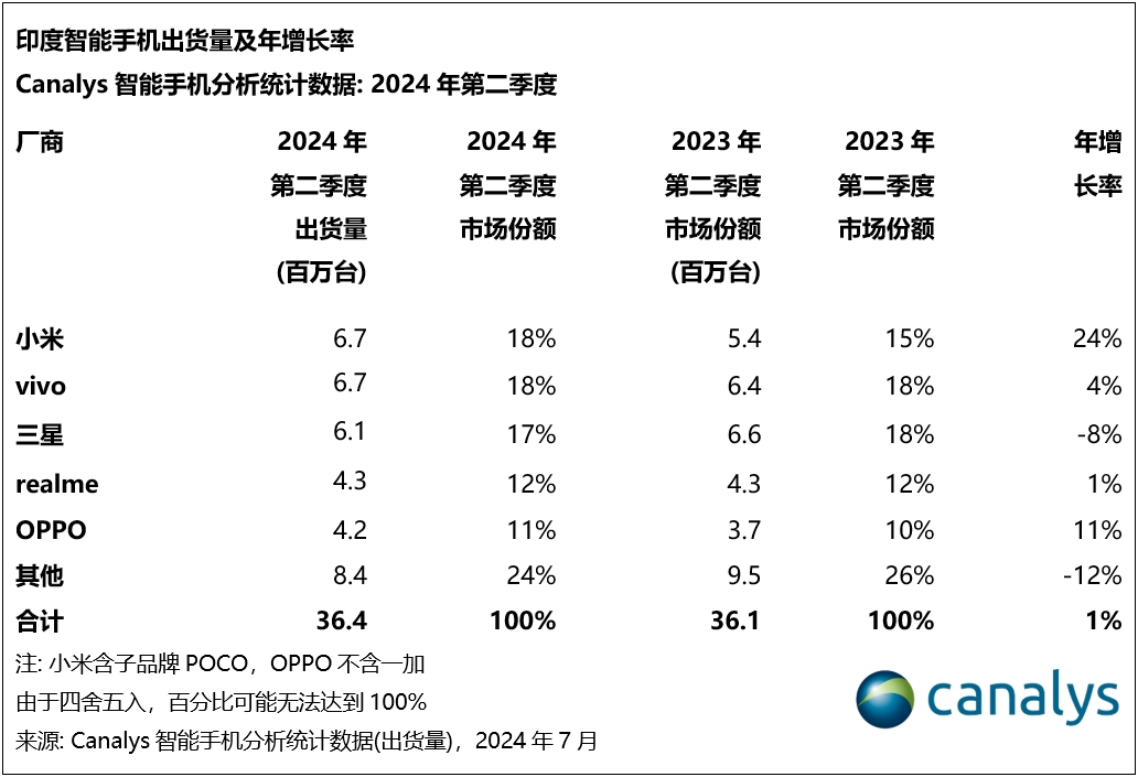 分析机构Canalys发布报告称,2024年第二季度,在季节性需求低迷以及部分地区极端天气等各种因素的影响下,印度智能手机市场微增1%,总出货量达3640万台。根据报告,小米在6个季度后,以670万台出货量及18%的市场份额,重夺榜首。