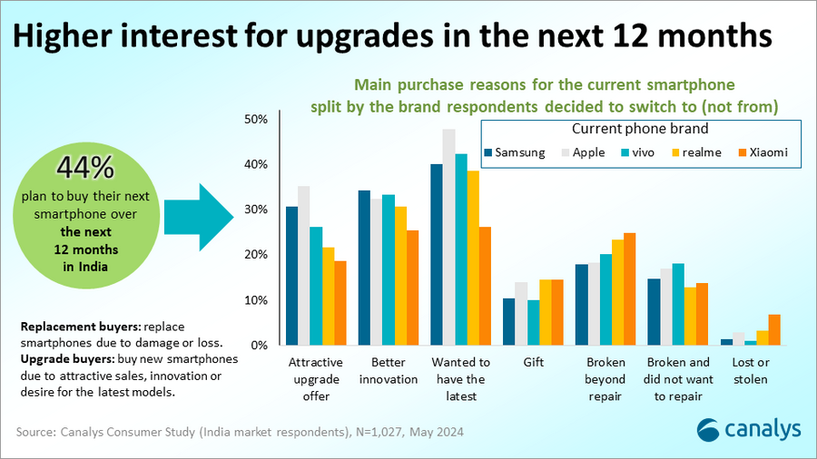 Canalys高级分析师Sanyam Chaurasia表示:“2024年第二季度,顶级大众市场品牌扩大了中高端产品组合,并将利用季初的销售来清理库存,为节日前的新机型腾出空间。小米等品牌扩大了中高端产品阵容,凭借色彩更新的红米Note 13 Pro系列和新推出的具有相机质量和独特皮革设计的小米14 Civi,推动了本季度的销量。与此同时,vivo在中端市场的成功是由v系列和Y200 Pro推动的,专注于精致的设计和相机功能,以及在LFR零售店的不断推广。realme还扩大了其中高档产品组合,推出了GT 6T和Number系列车型,并计划在雨季电子商务销售期间清理库存。”