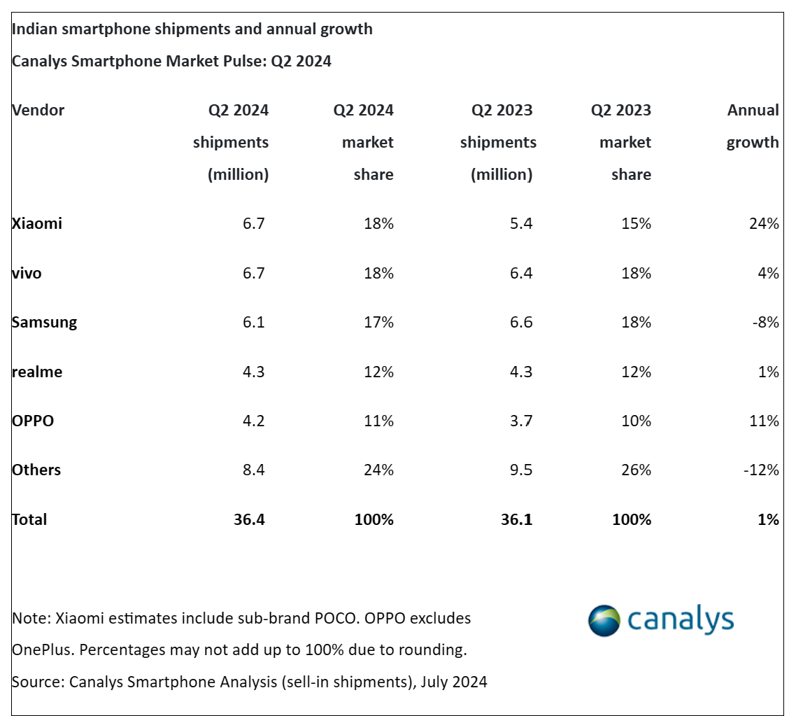 Canalys的最新研究显示,由于选举、季节性需求低迷以及一些地区的极端天气条件,印度智能手机市场在2024年第二季度的出货量仅增长了1%,总计出货3640万部。库存水平仍然很高,一些供应商在本季度继续推出价格更高的新设备,而其他供应商则集中精力减少现有库存,以便在节日季节之前优化库存。小米在六个季度后重新夺回了榜首位置,以670万部的出货量占据了18%的市场份额。vivo紧随其后,在价格合理的5G和中端机型的推动下,出货量也达到670万部。三星排名第三,出货量为610万部。realme和OPPO(不包括一加)分别以430万部和420万部的出货量位居前五。