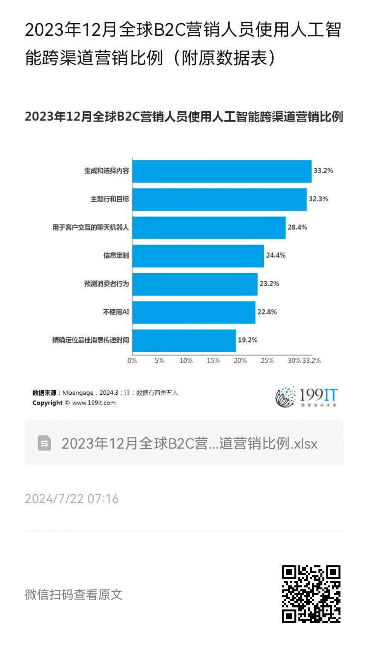 - 2023年12月人工智能对全球B2C营销人员业务影响比例(附原数据表)