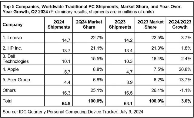 苹果排在第四,出货量为570万台,同比增长20.8%,成为前五大厂商中增幅最大,市场占有率为8.8%。宏碁位列第五,出货量为440万台,同比增长13.8%,市场占有率为6.8%。