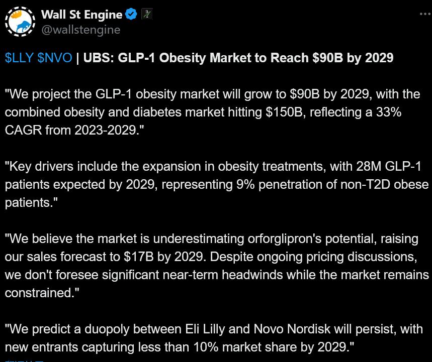 瑞银集团预测,礼来和诺和诺德之间的双头垄断将持续下去,到 2029 年,新进入者占据的市场份额将低于 10%。