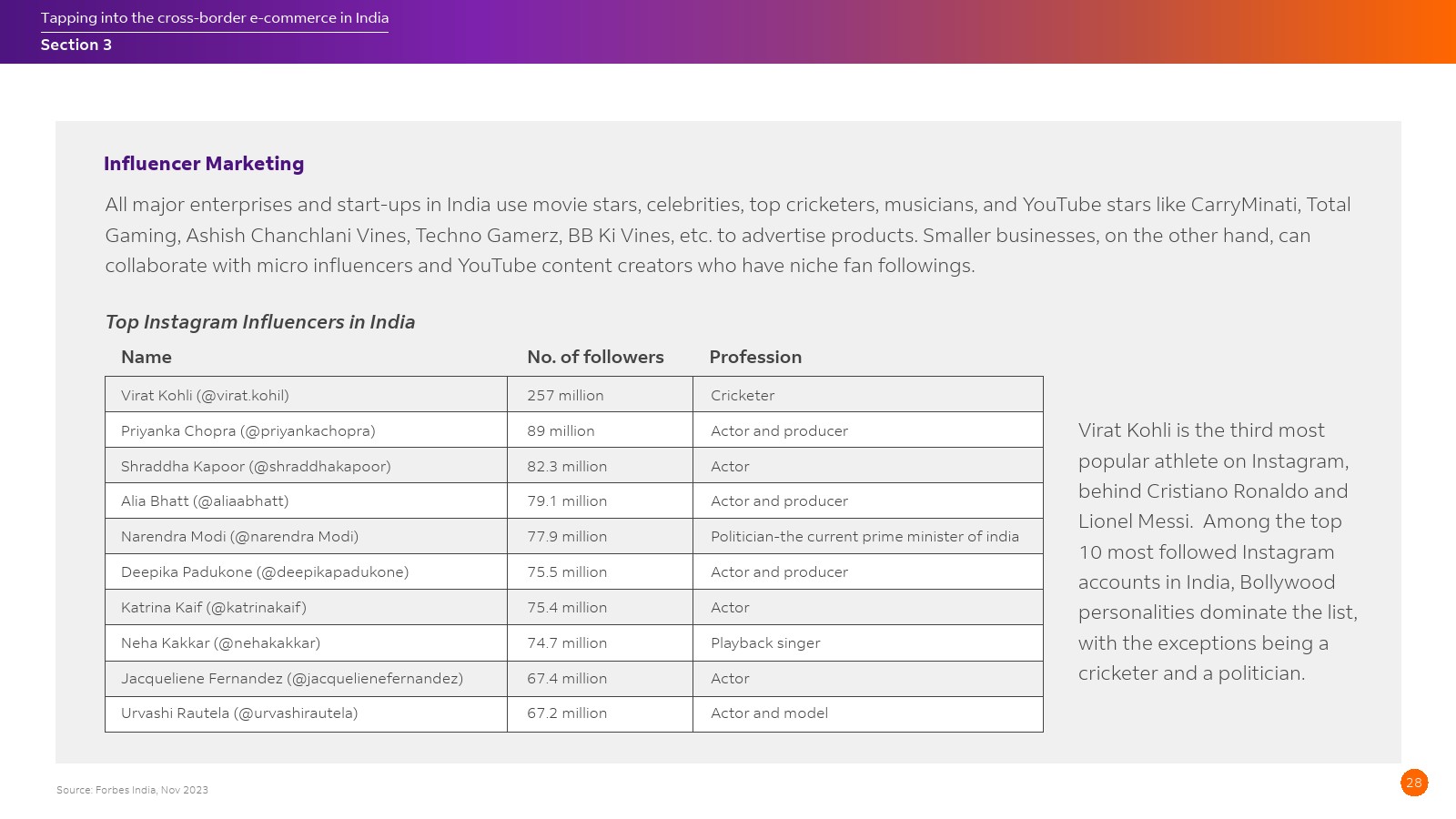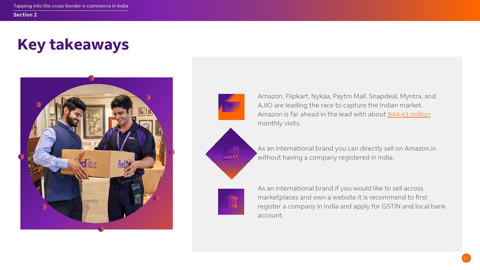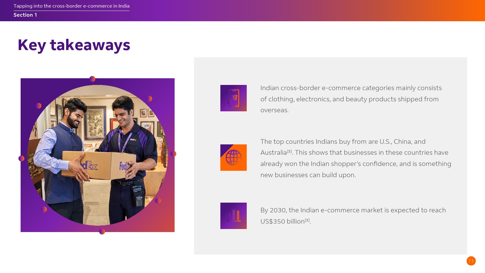 FedEx发布了“进军印度跨境电子商务市场”。印度的跨境电商类别主要包括从海外运来的服装、电子产品和美容产品。