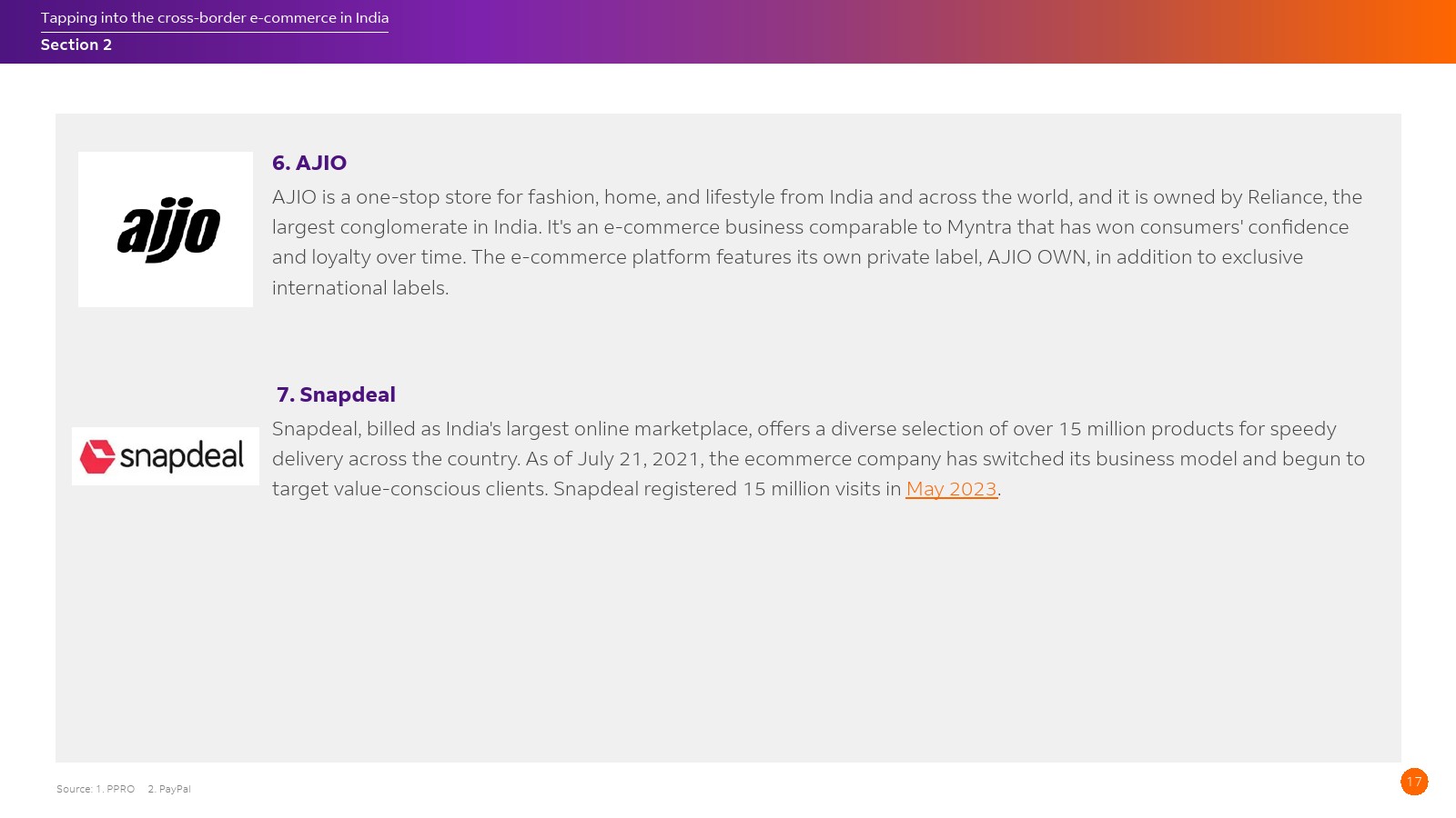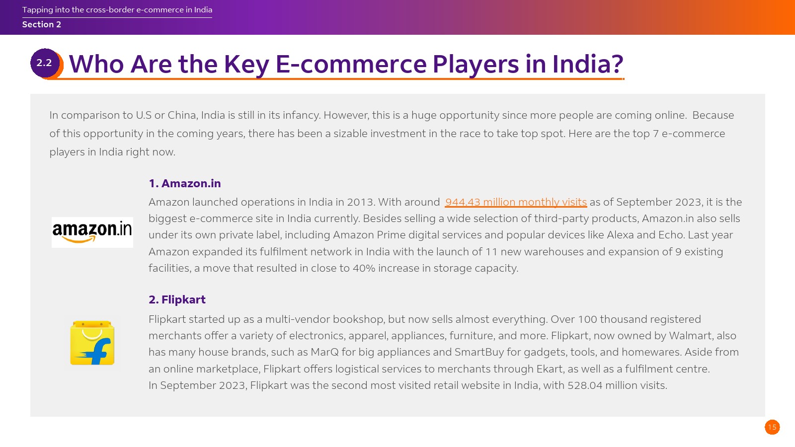 亚马逊、Flipkart、Nykaa、Paytm Mall、Snapdeal、Myntra和ajio在占领印度市场的竞争中处于领先地位。亚马逊遥遥领先,月访问量约为9.4443亿次。