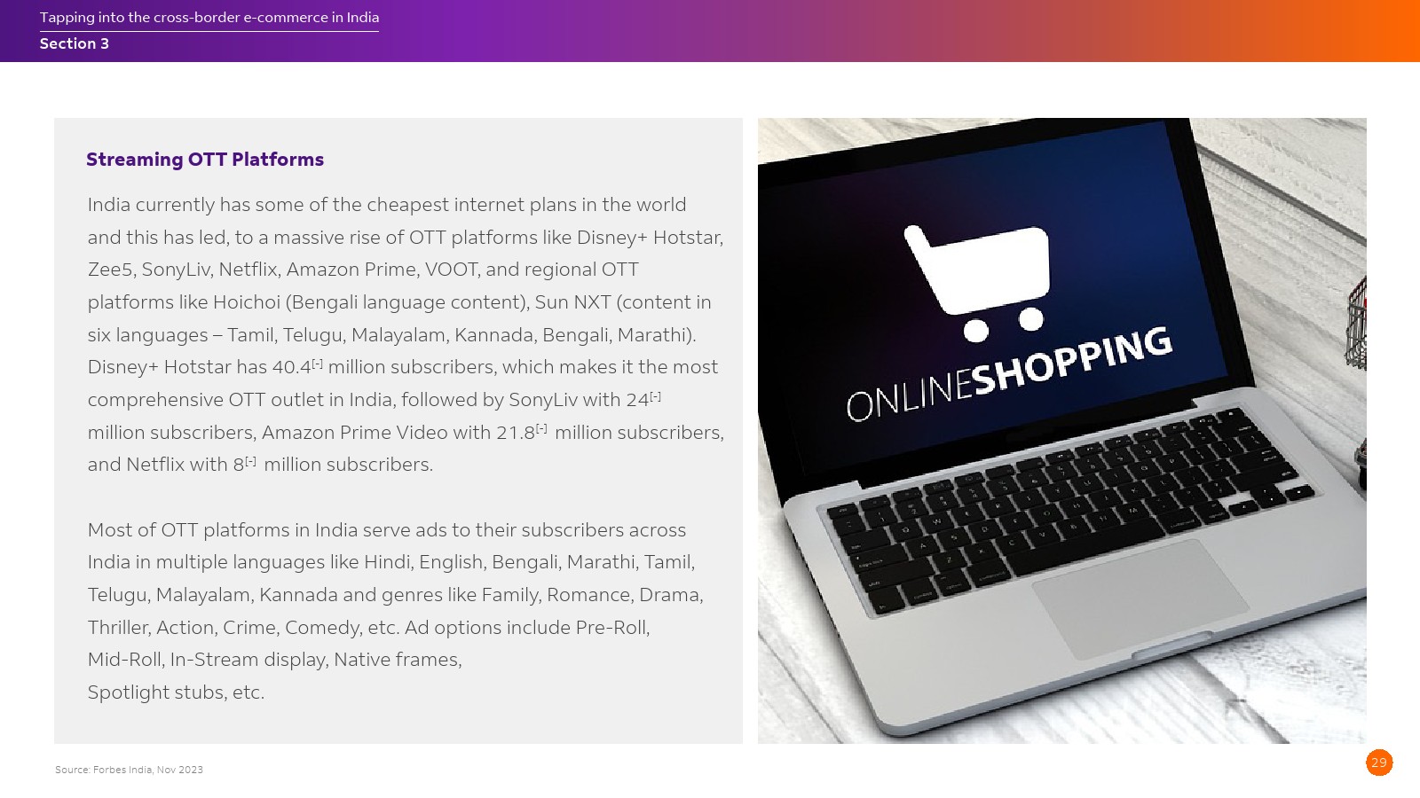 Facebook是印度领先的社交媒体网络。Disney+ Hotstar拥有4040万用户,是印度最全面的OTT平台,其次是亚马逊Prime Video,拥有2200万用户。