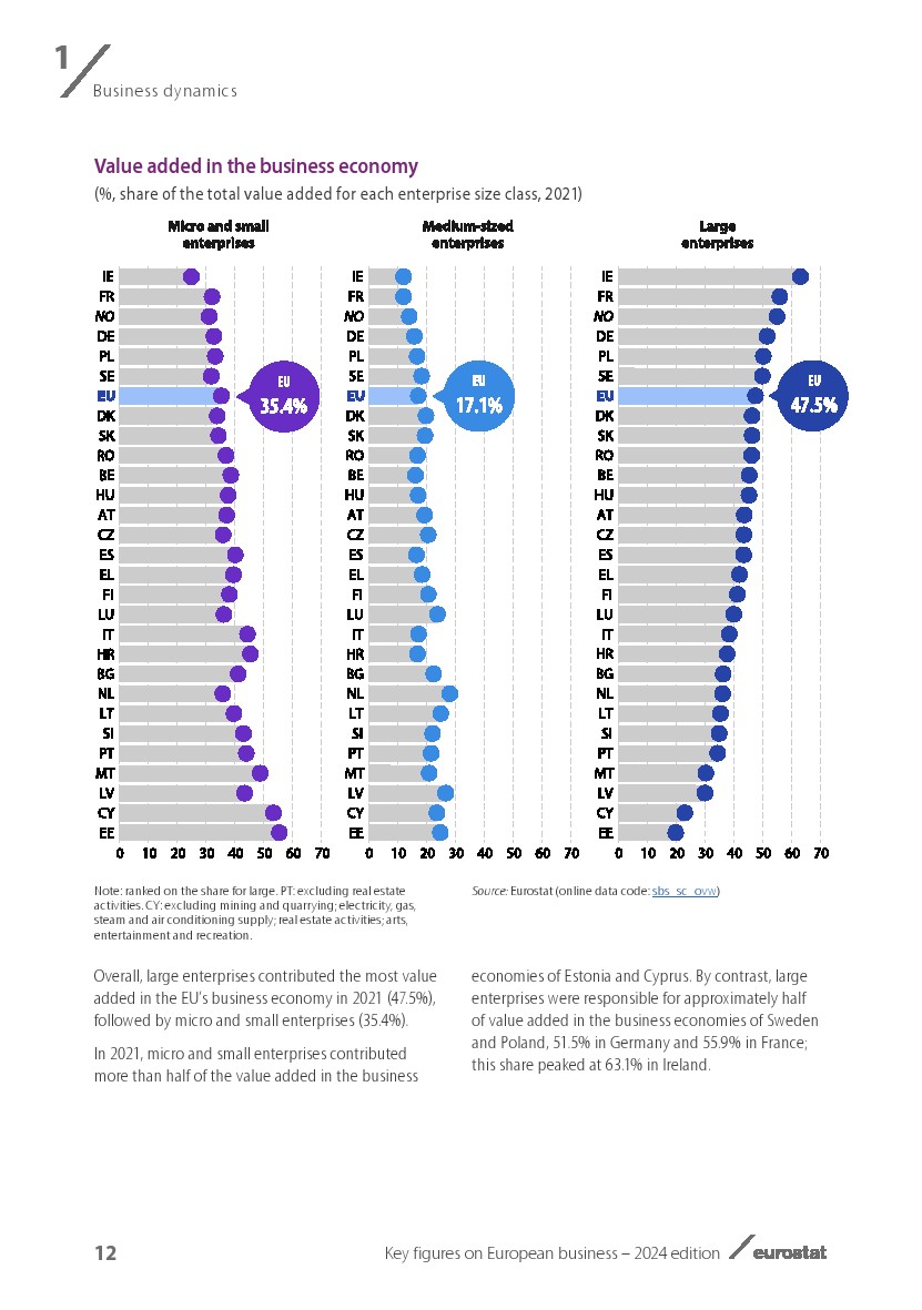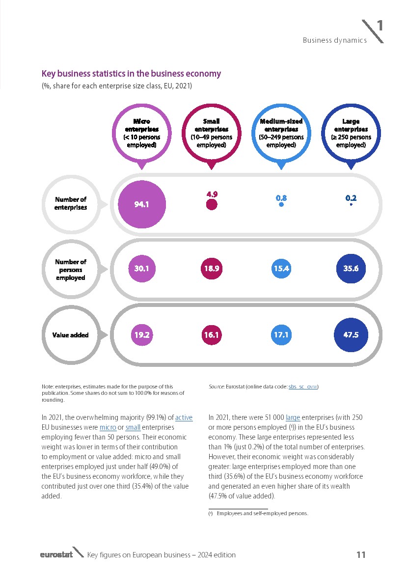 2021年,绝大多数活跃的欧盟企业(99.1%)是雇用人数少于50人的微型或小型企业。就其对就业或附加值的贡献而言,它们的经济权重较低:微型和小型企业雇用了欧盟商业经济劳动力的49%,而它们对附加值的贡献略高于35.4%。