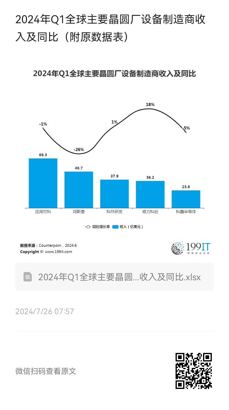 2024年Q1全球主要晶圆厂设备制造商收入及同比(附原数据表) ​​​