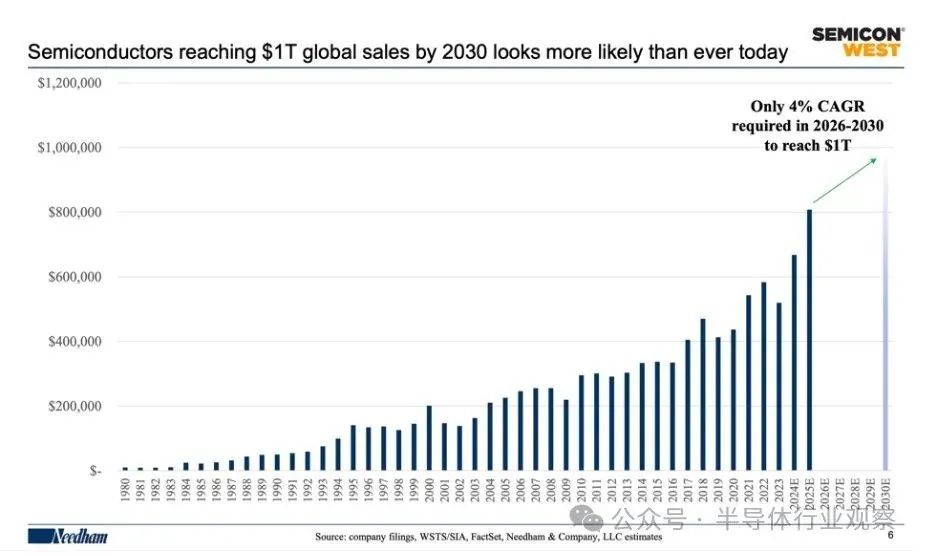 分析师在本月初于旧金山举行的年度 Semicon West 贸易展上报告称,全球半导体销售额有望在 2030 年达到 1 万亿美元。Needham & Co 的 Charles Shi 和 Gartner 的 Gaurav Gupta 对此表示赞同,Gupta 预计这一里程碑将在 2031 年至 2032 年之间实现。