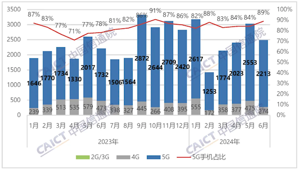 中国信通院公布了2024年6月国内手机市场运行分析报告。其中显示,2024年6月国内市场手机出货量2491.2万部,同比增长12.5%,其中5G手机2213.1万部,同比增27.8%,占同期手机出货量的88.8%。国内手机上市新机型26款,同比增长18.2%,其中5G手机11款,同比增长57.1%,占同期手机上市新机型数量的42.3%。