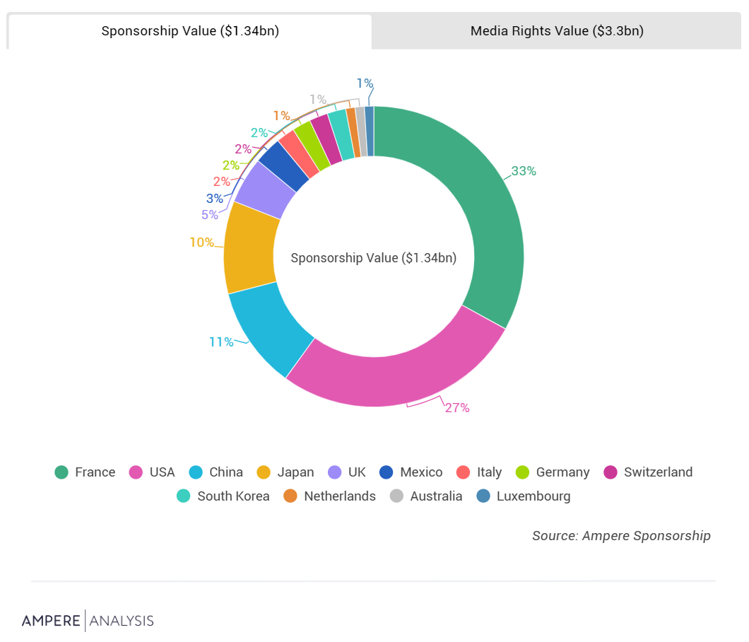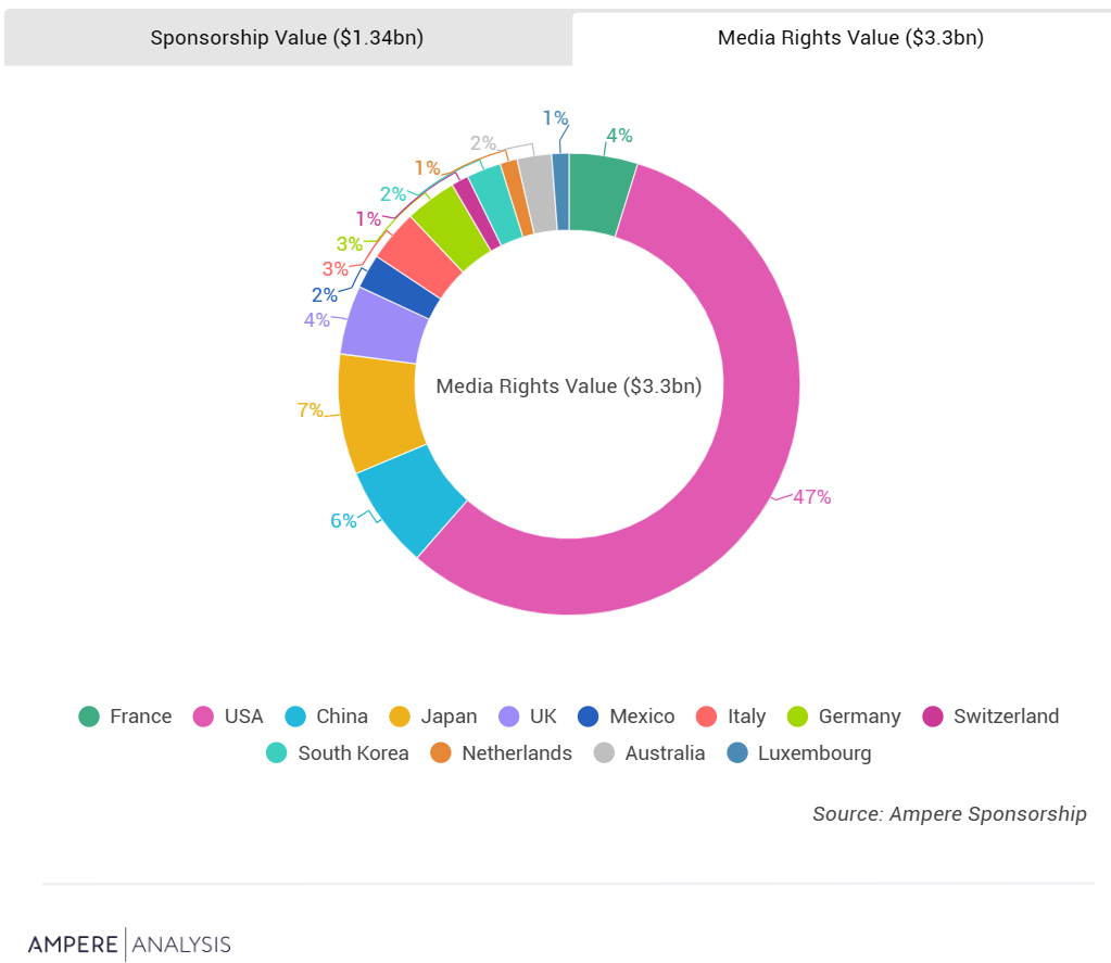 美国、中国、日本和欧洲五大市场(法国、德国、意大利、西班牙和英国)占媒体版权和赞助价值总和的80%以上,这凸显了少数国家在资助奥运会方面的重要性,尤其是在赞助收入方面。这8个国家占媒体版权价值(25亿美元)的75%,但占13.4亿美元赞助收入的98%。
