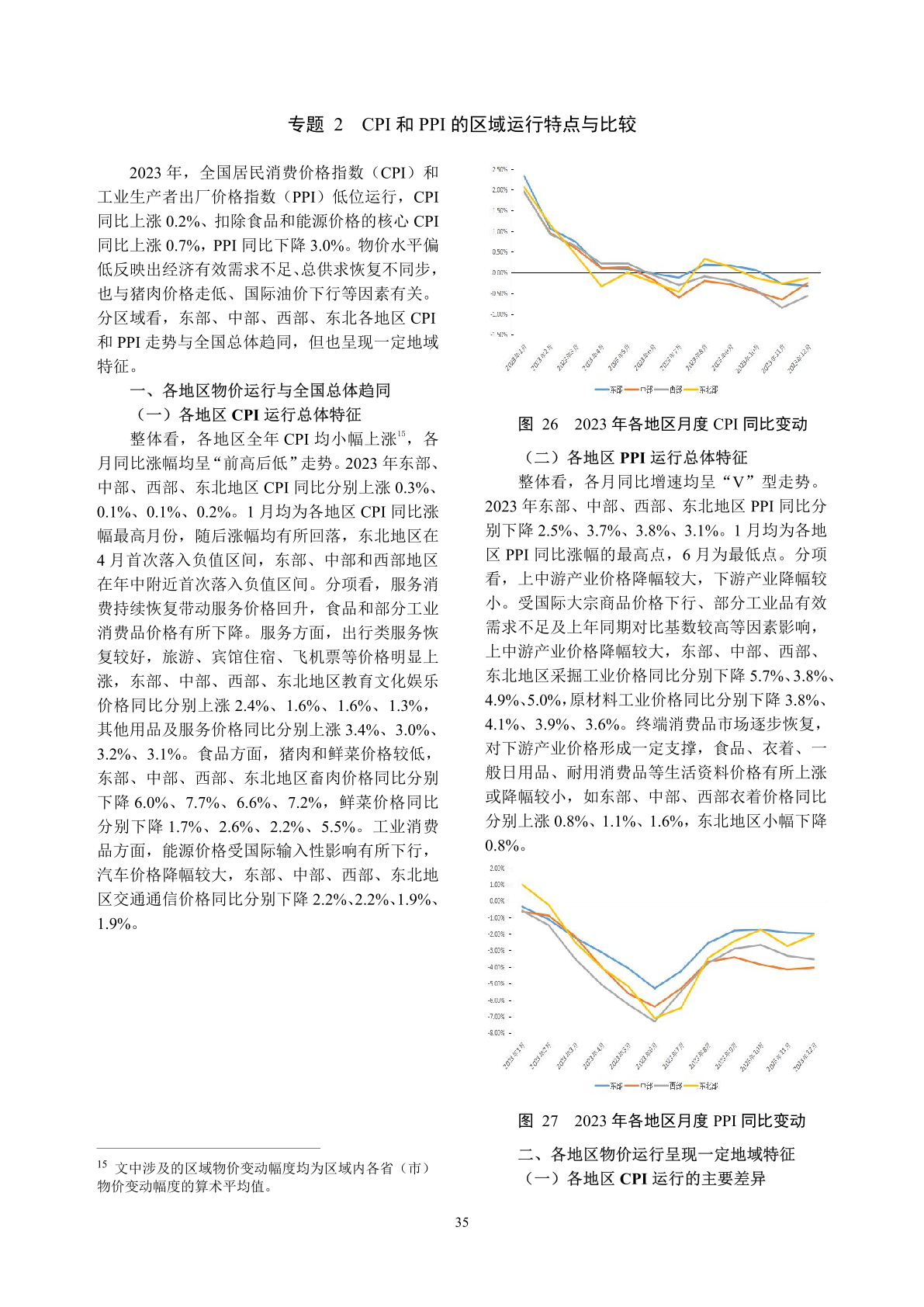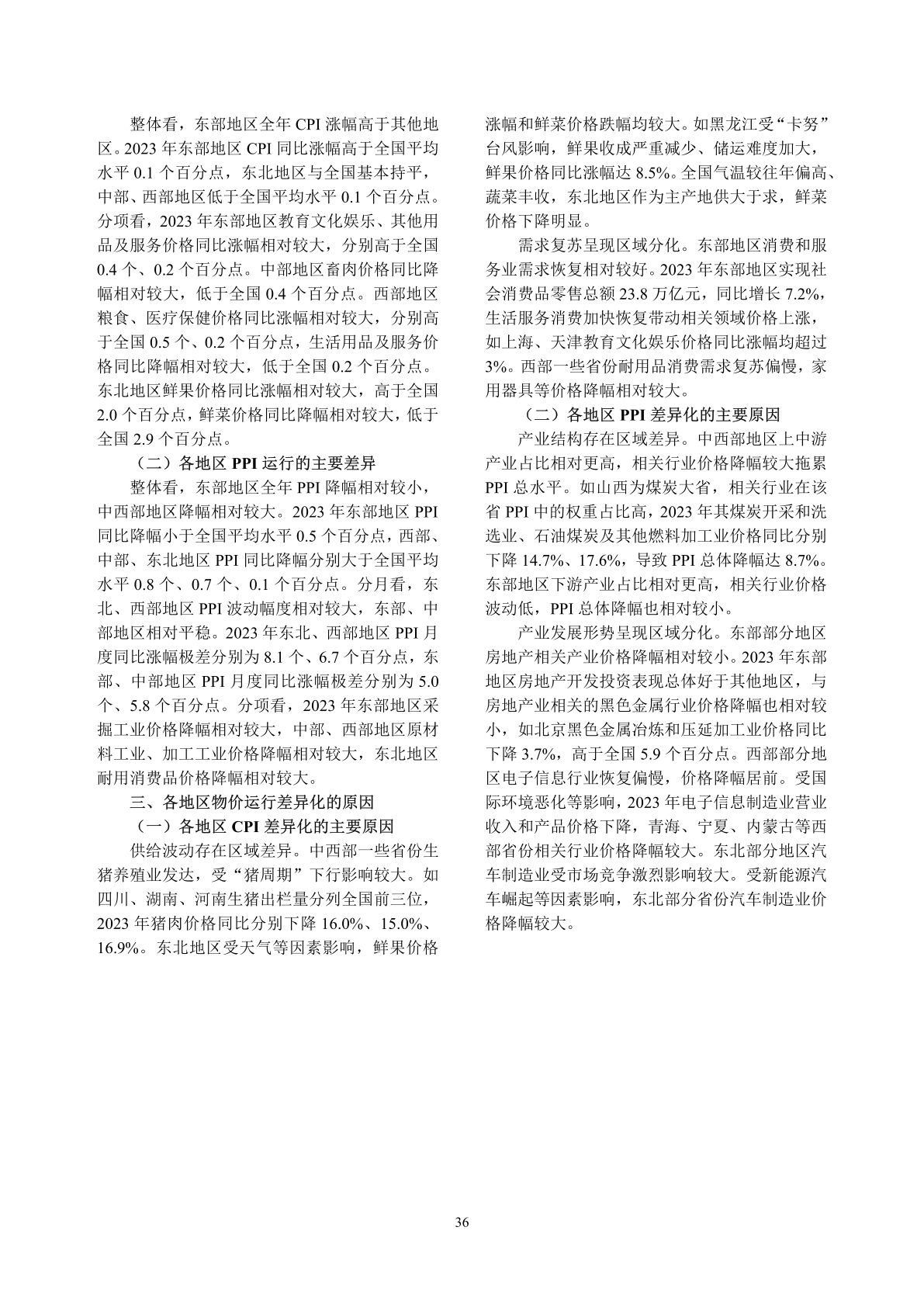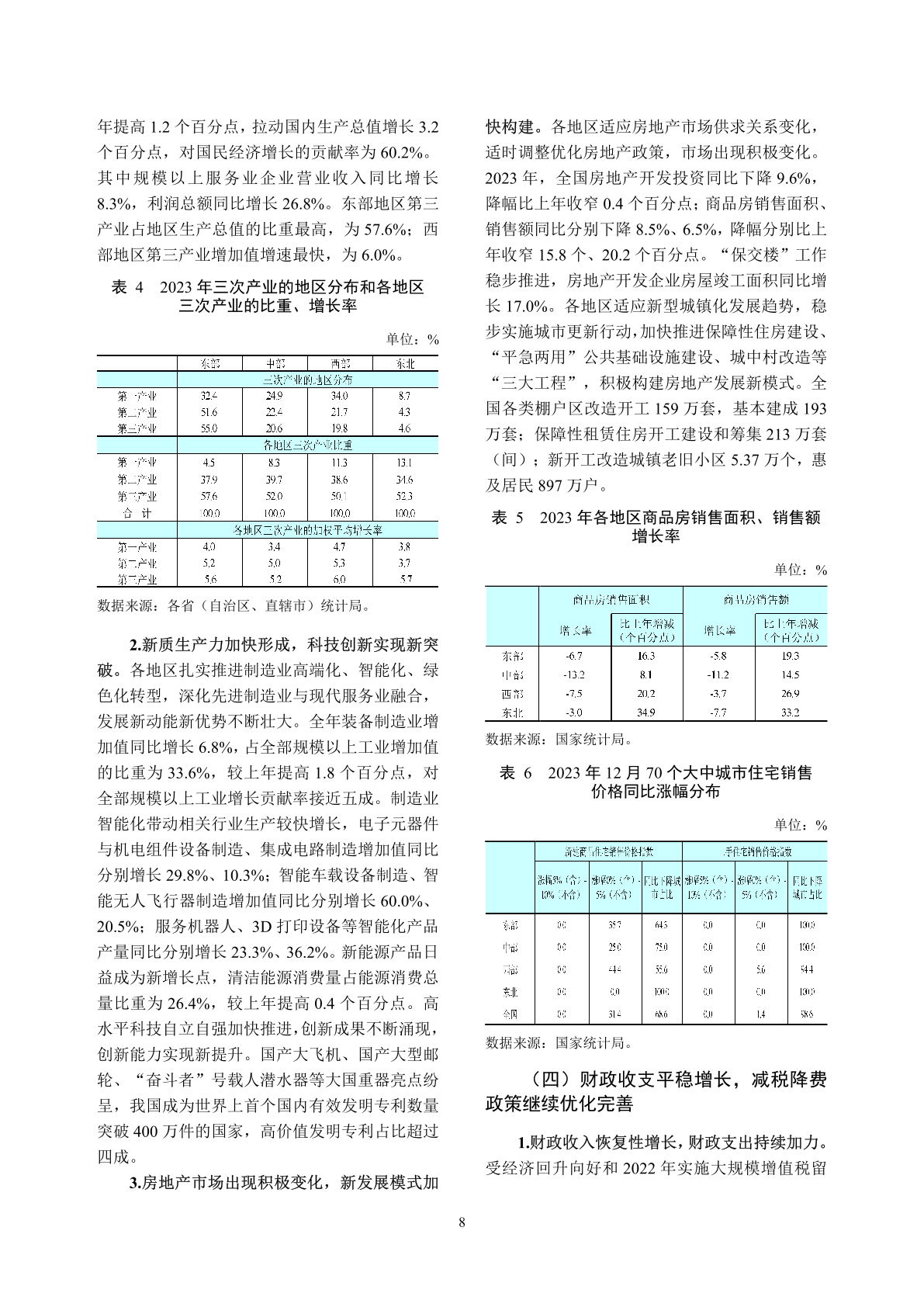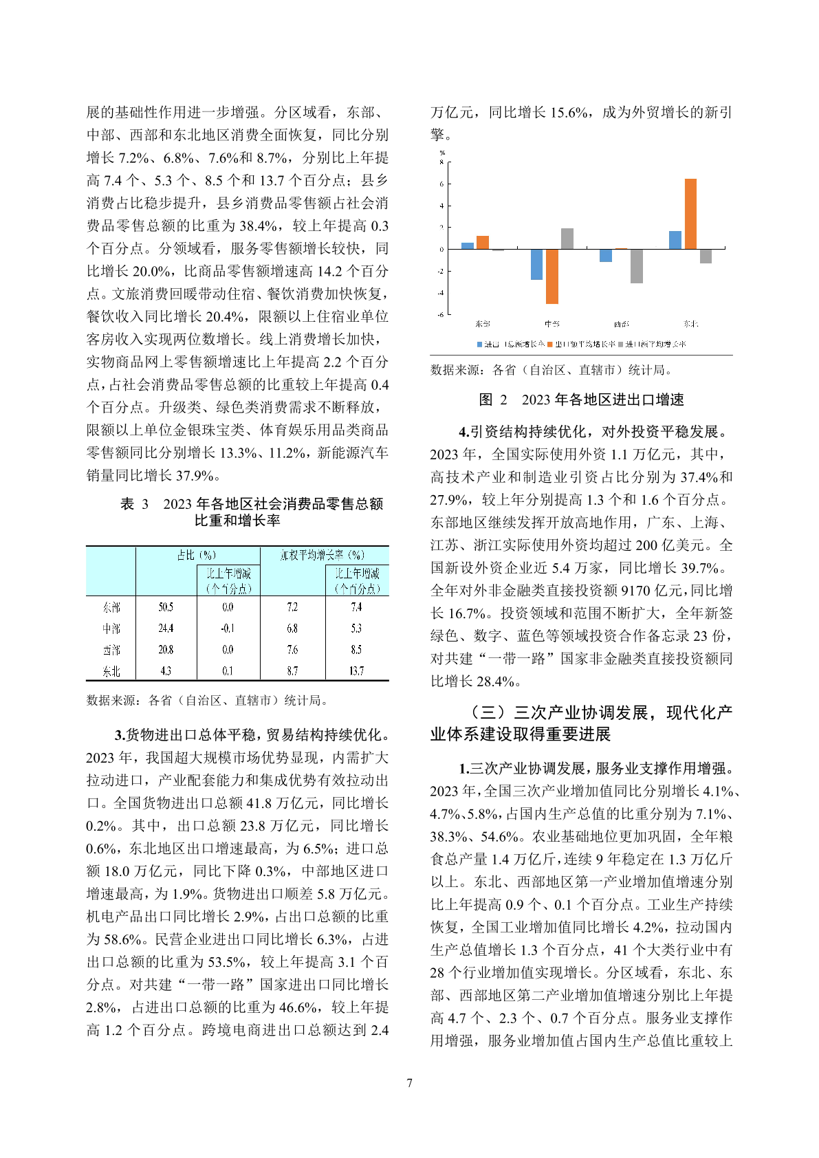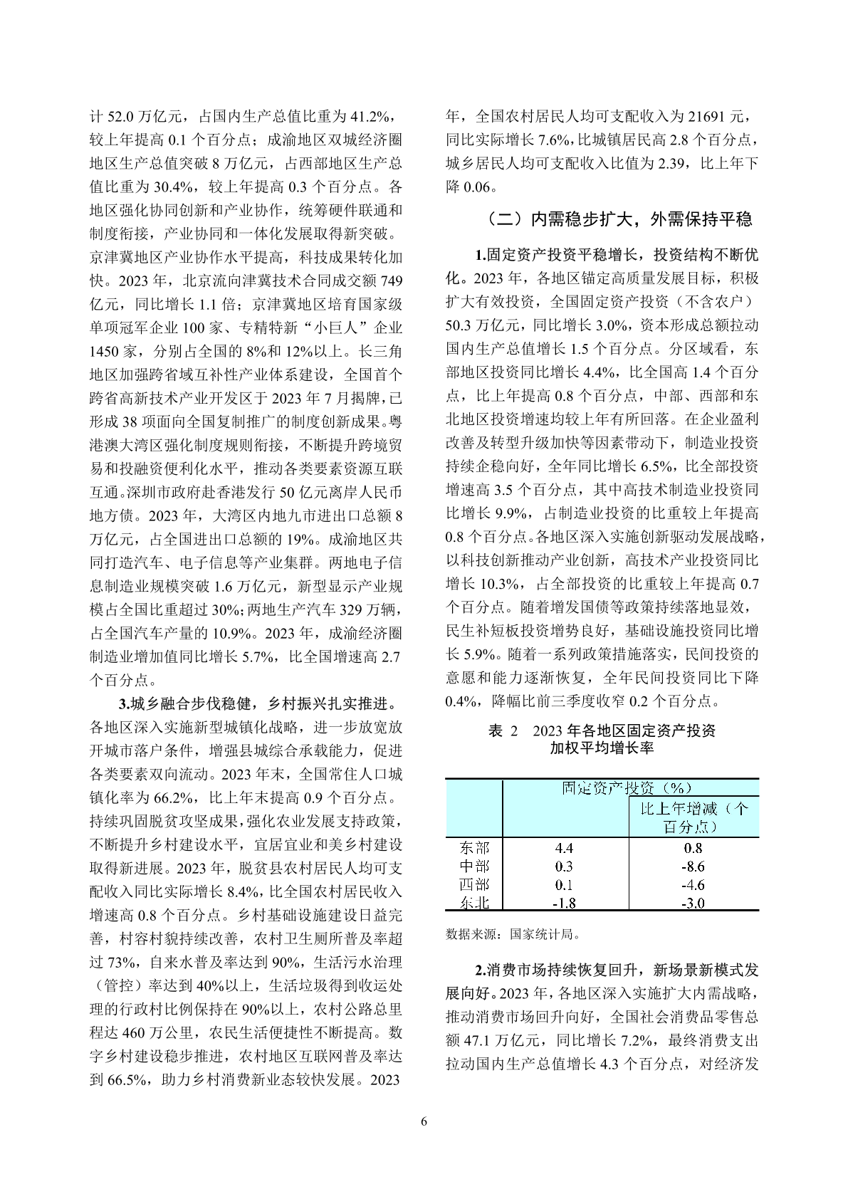 2023 年,区域经济金融运行主要呈现以下特点:一是区域发展协调性平衡性不断增 强,城乡融合发展步伐稳健。东部、中部、西部和东北地区生产总值增速全面加快,区 域间经济增速差距收窄,区域经济发展更加协调。高质量发展动力源引擎带动作用有效发 挥,产业协同和一体化发展取得新突破。城乡融合步伐稳健,常住人口城镇化率稳步提高。乡村振兴取得新成效,农民生活便捷性不断提高。二是固定资产投资平稳增长,投资结 构不断优化。固定资产投资(不含农户)同比增长 3.0%,资本形成总额拉动国内生产总 值增长 1.5 个百分点。其中,制造业投资同比增长 6.5%,高技术产业投资同比增长 10.3%, 基础设施投资同比增长 5.9%,民间投资意愿和能力逐渐恢复。分区域看,东部地区固定