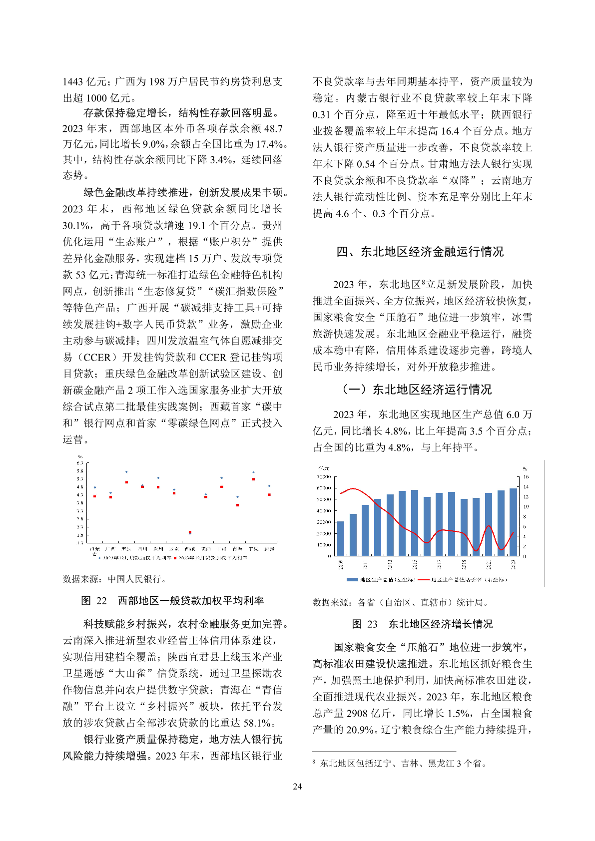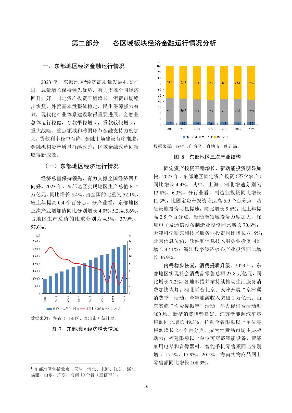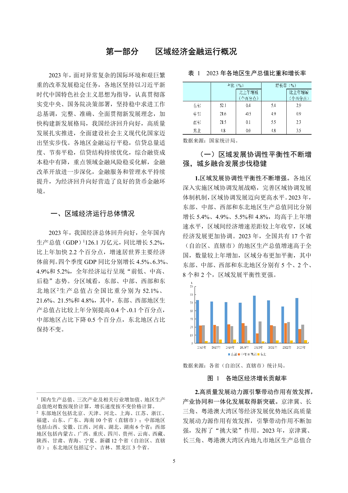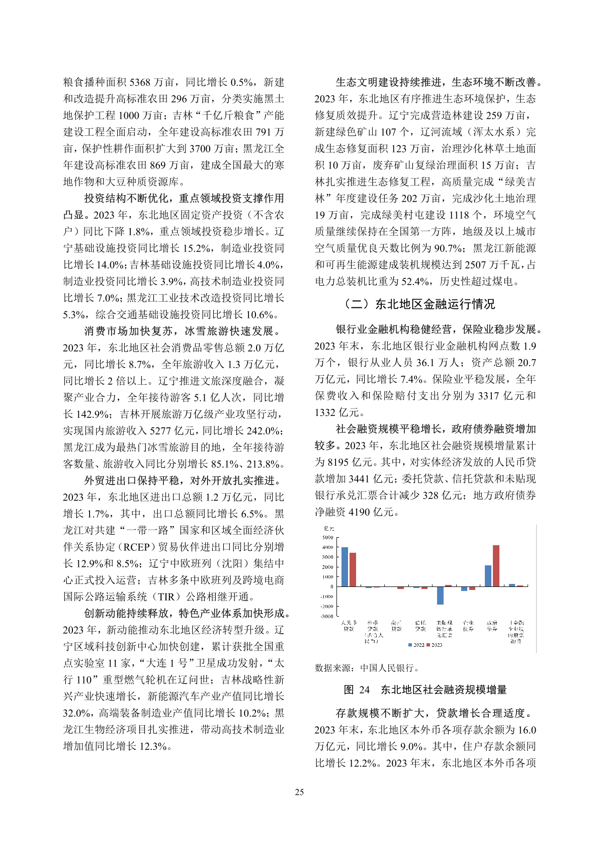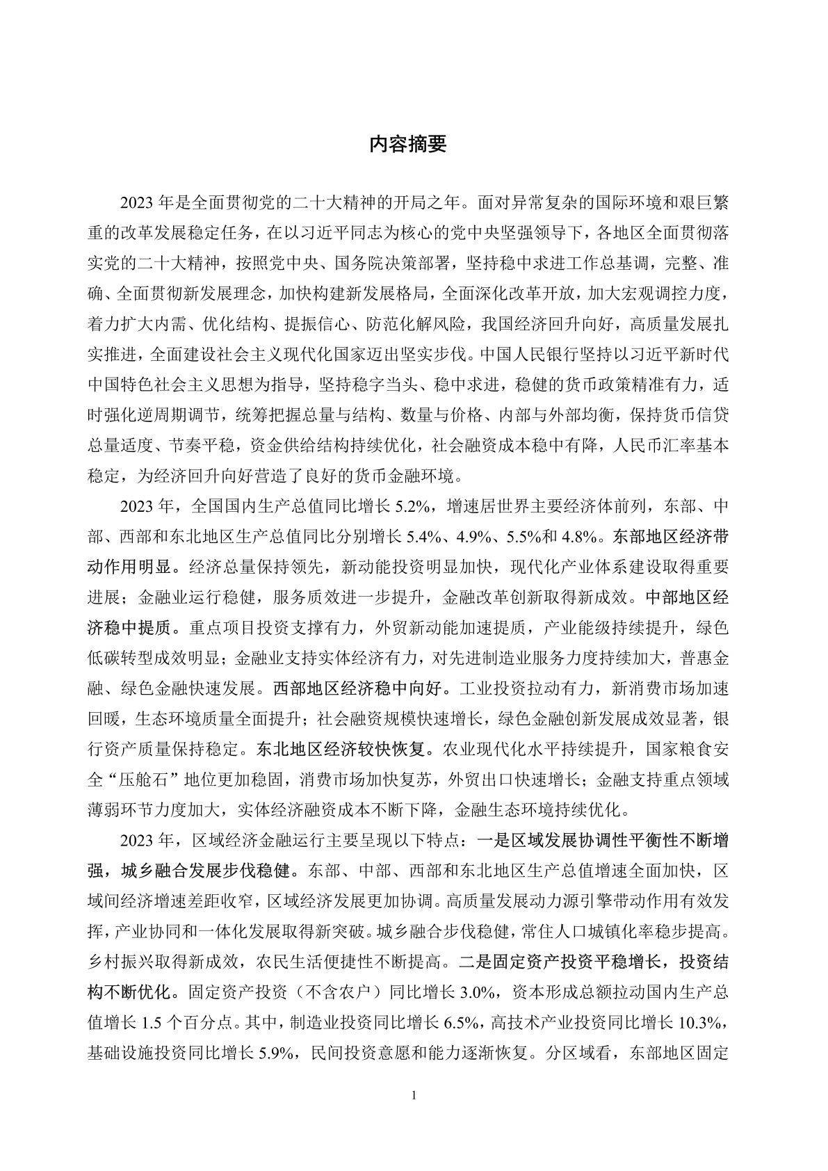 2023 年,全国国内生产总值同比增长 5.2%,增速居世界主要经济体前列,东部、中 部、西部和东北地区生产总值同比分别增长 5.4%、4.9%、5.5%和 4.8%。东部地区经济带 动作用明显。经济总量保持领先,新动能投资明显加快,现代化产业体系建设取得重要 进展;金融业运行稳健,服务质效进一步提升,金融改革创新取得新成效。中部地区经 济稳中提质。重点项目投资支撑有力,外贸新动能加速提质,产业能级持续提升,绿色 低碳转型成效明显;金融业支持实体经济有力,对先进制造业服务力度持续加大,普惠金 融、绿色金融快速发展。西部地区经济稳中向好。工业投资拉动有力,新消费市场加速 回暖,生态环境质量全面提升;社会融资规模快速增长,绿色金融创新发展成效显著,银 行资产质量保持稳定。东北地区经济较快恢复。农业现代化水平持续提升,国家粮食安 全“压舱石”地位更加稳固,消费市场加快复苏,外贸出口快速增长;金融支持重点领域 薄弱环节力度加大,实体经济融资成本不断下降,金融生态环境持续优化。