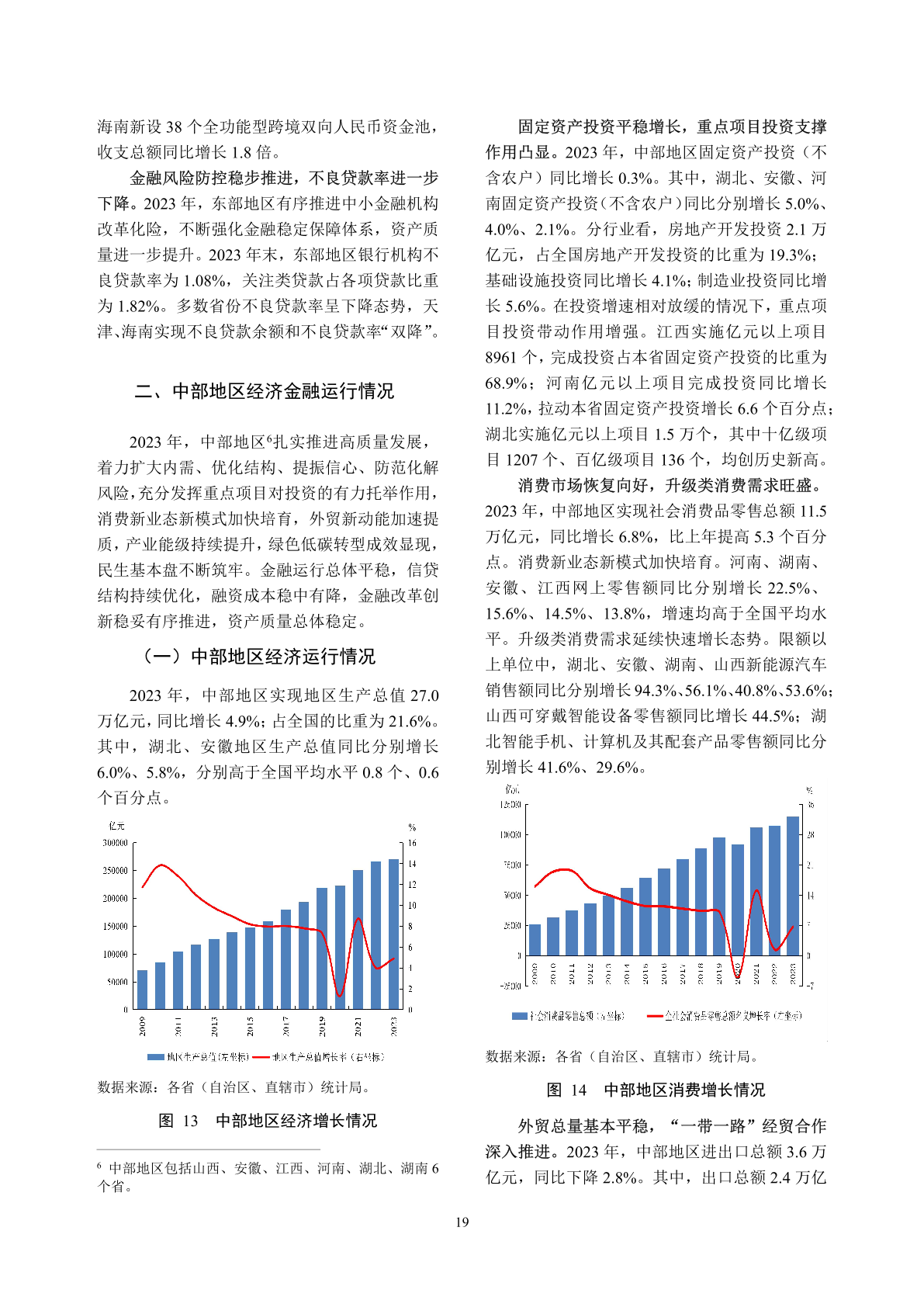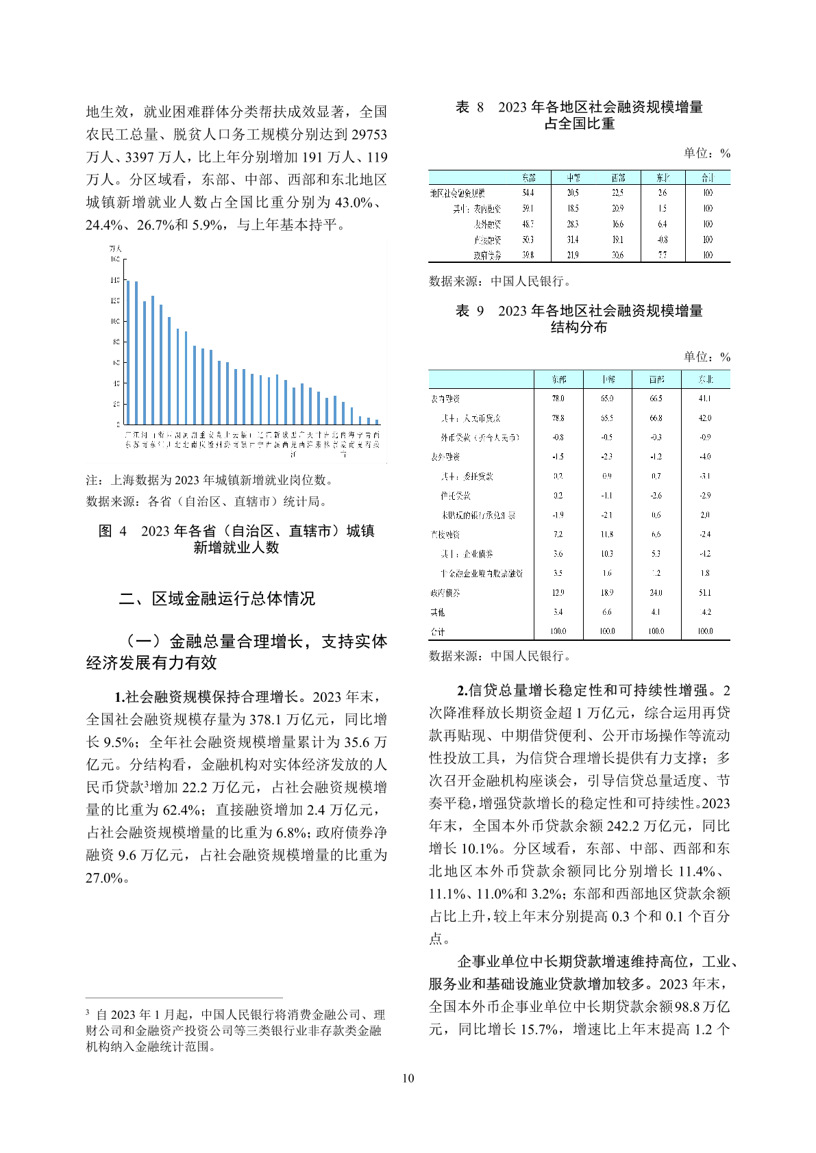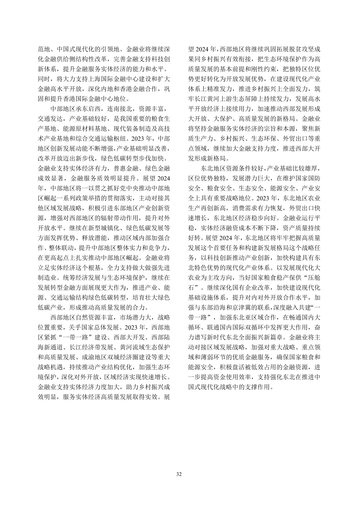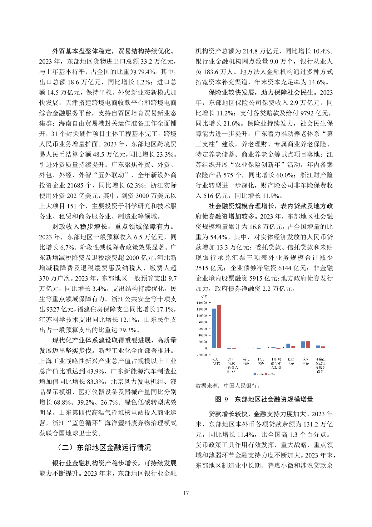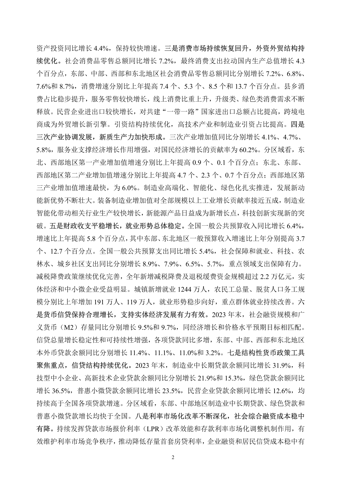 2023 年,全国国内生产总值同比增长 5.2%,增速居世界主要经济体前列,东部、中 部、西部和东北地区生产总值同比分别增长 5.4%、4.9%、5.5%和 4.8%。东部地区经济带 动作用明显。经济总量保持领先,新动能投资明显加快,现代化产业体系建设取得重要 进展;金融业运行稳健,服务质效进一步提升,金融改革创新取得新成效。中部地区经 济稳中提质。重点项目投资支撑有力,外贸新动能加速提质,产业能级持续提升,绿色 低碳转型成效明显;金融业支持实体经济有力,对先进制造业服务力度持续加大,普惠金 融、绿色金融快速发展。西部地区经济稳中向好。工业投资拉动有力,新消费市场加速 回暖,生态环境质量全面提升;社会融资规模快速增长,绿色金融创新发展成效显著,银 行资产质量保持稳定。东北地区经济较快恢复。农业现代化水平持续提升,国家粮食安 全“压舱石”地位更加稳固,消费市场加快复苏,外贸出口快速增长;金融支持重点领域 薄弱环节力度加大,实体经济融资成本不断下降,金融生态环境持续优化。