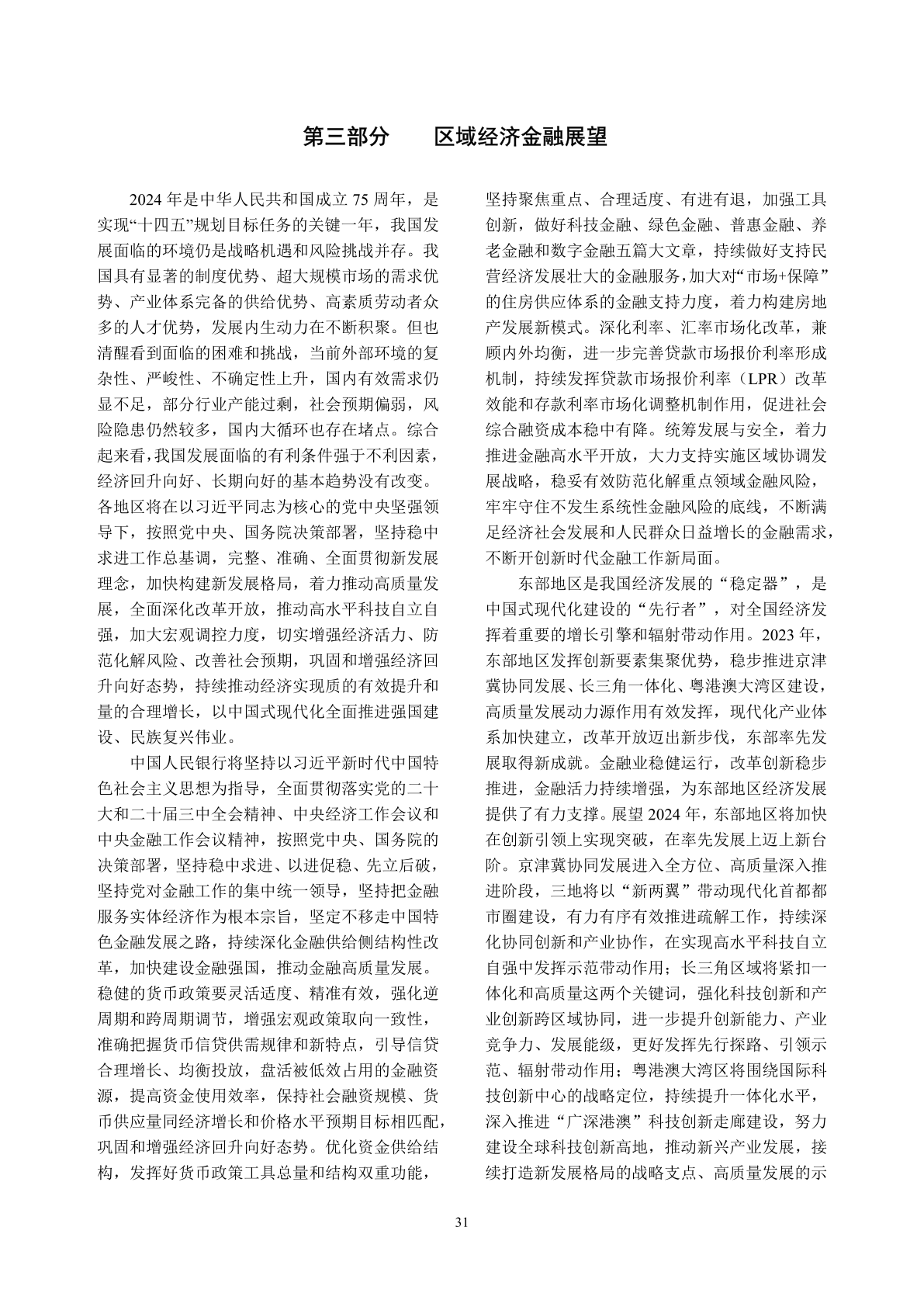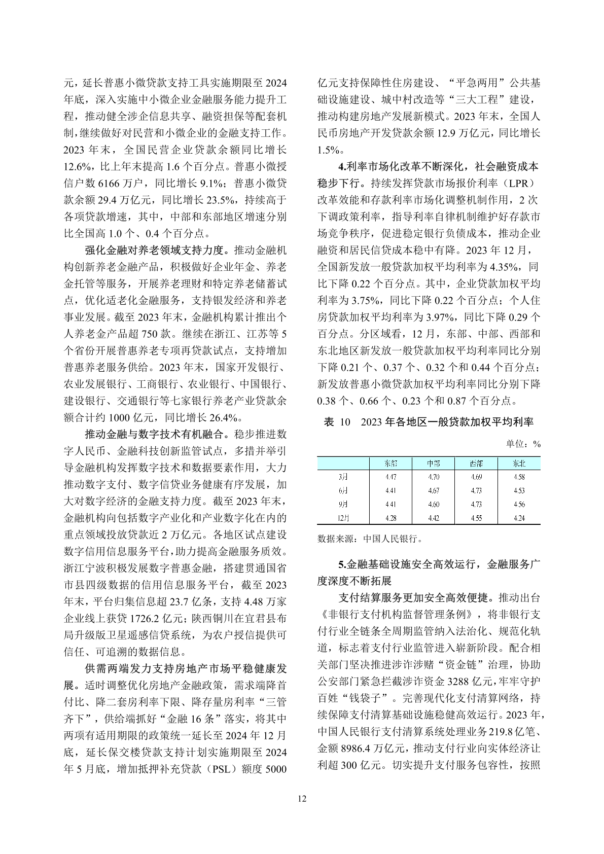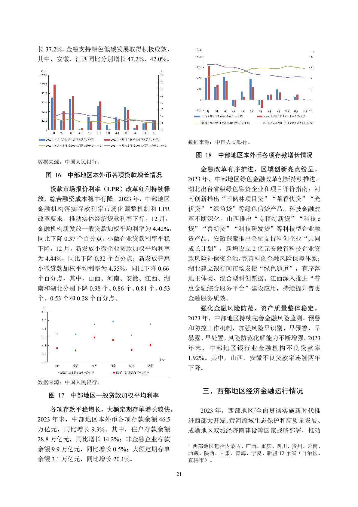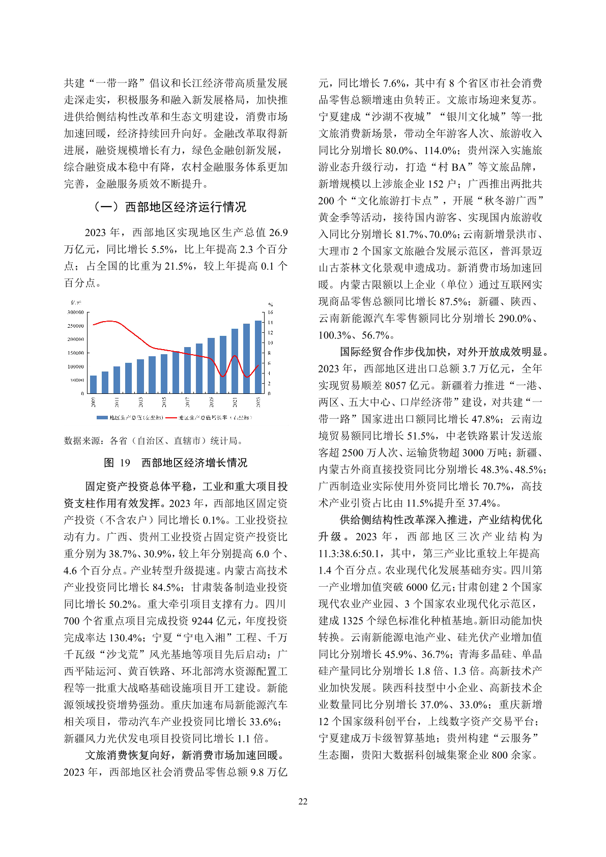 2023 年,全国国内生产总值同比增长 5.2%,增速居世界主要经济体前列,东部、中 部、西部和东北地区生产总值同比分别增长 5.4%、4.9%、5.5%和 4.8%。东部地区经济带 动作用明显。经济总量保持领先,新动能投资明显加快,现代化产业体系建设取得重要 进展;金融业运行稳健,服务质效进一步提升,金融改革创新取得新成效。中部地区经 济稳中提质。重点项目投资支撑有力,外贸新动能加速提质,产业能级持续提升,绿色 低碳转型成效明显;金融业支持实体经济有力,对先进制造业服务力度持续加大,普惠金 融、绿色金融快速发展。西部地区经济稳中向好。工业投资拉动有力,新消费市场加速 回暖,生态环境质量全面提升;社会融资规模快速增长,绿色金融创新发展成效显著,银 行资产质量保持稳定。东北地区经济较快恢复。农业现代化水平持续提升,国家粮食安 全“压舱石”地位更加稳固,消费市场加快复苏,外贸出口快速增长;金融支持重点领域 薄弱环节力度加大,实体经济融资成本不断下降,金融生态环境持续优化。