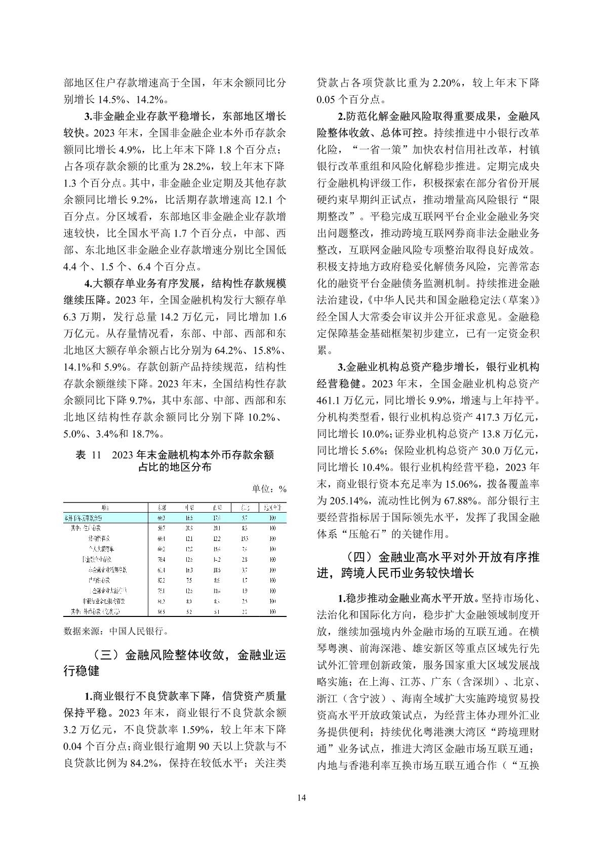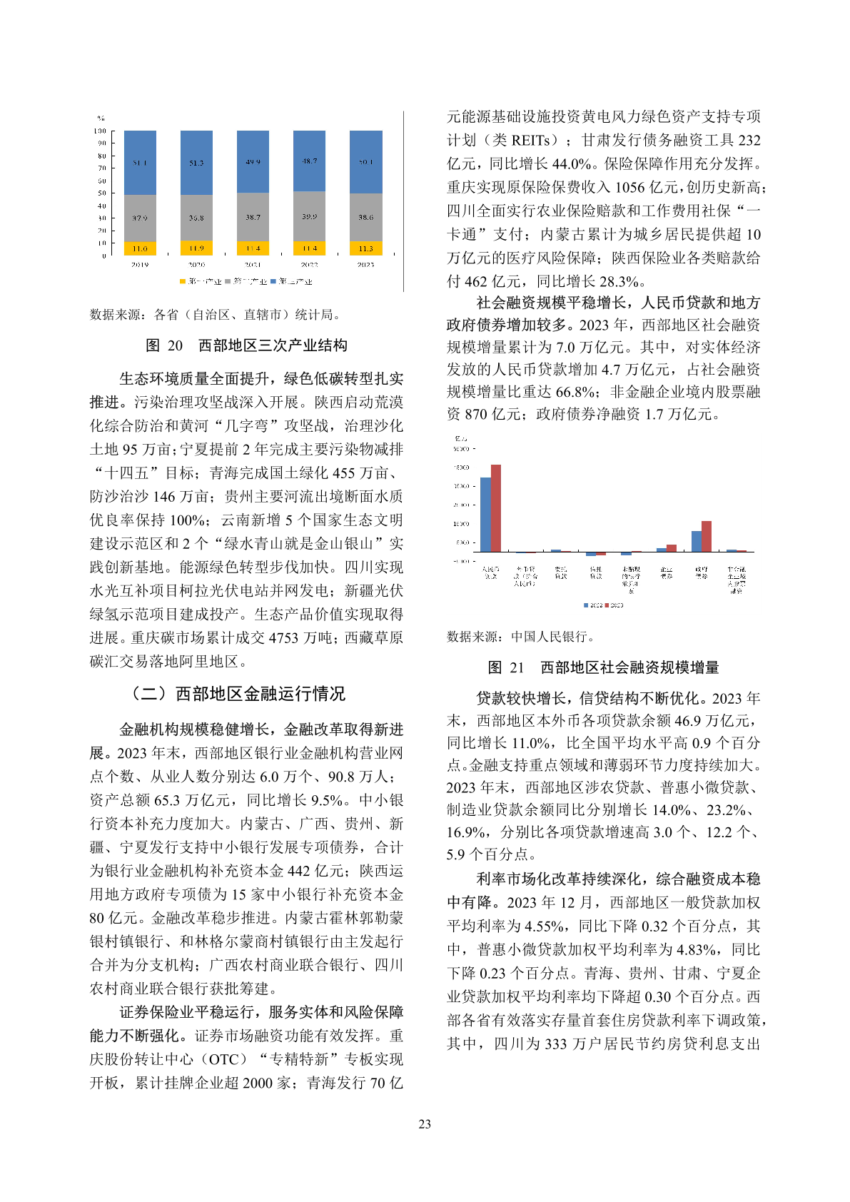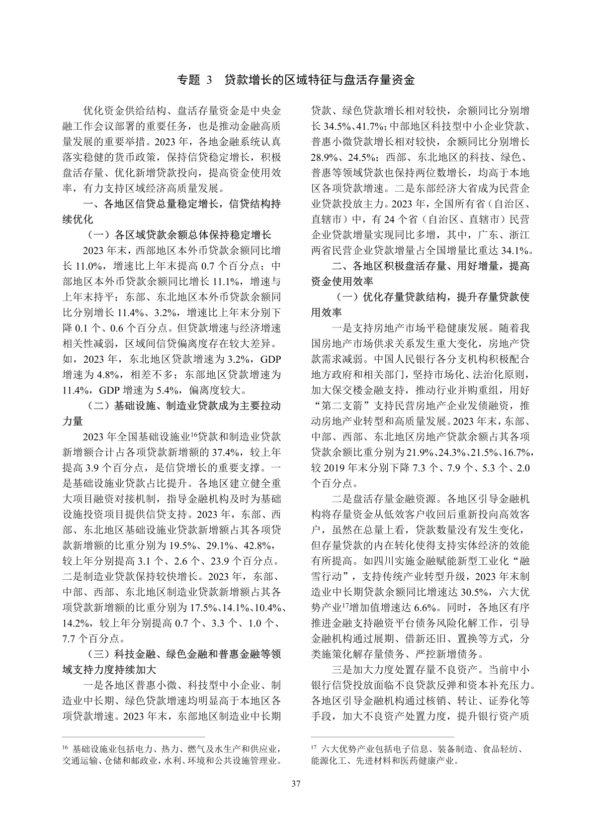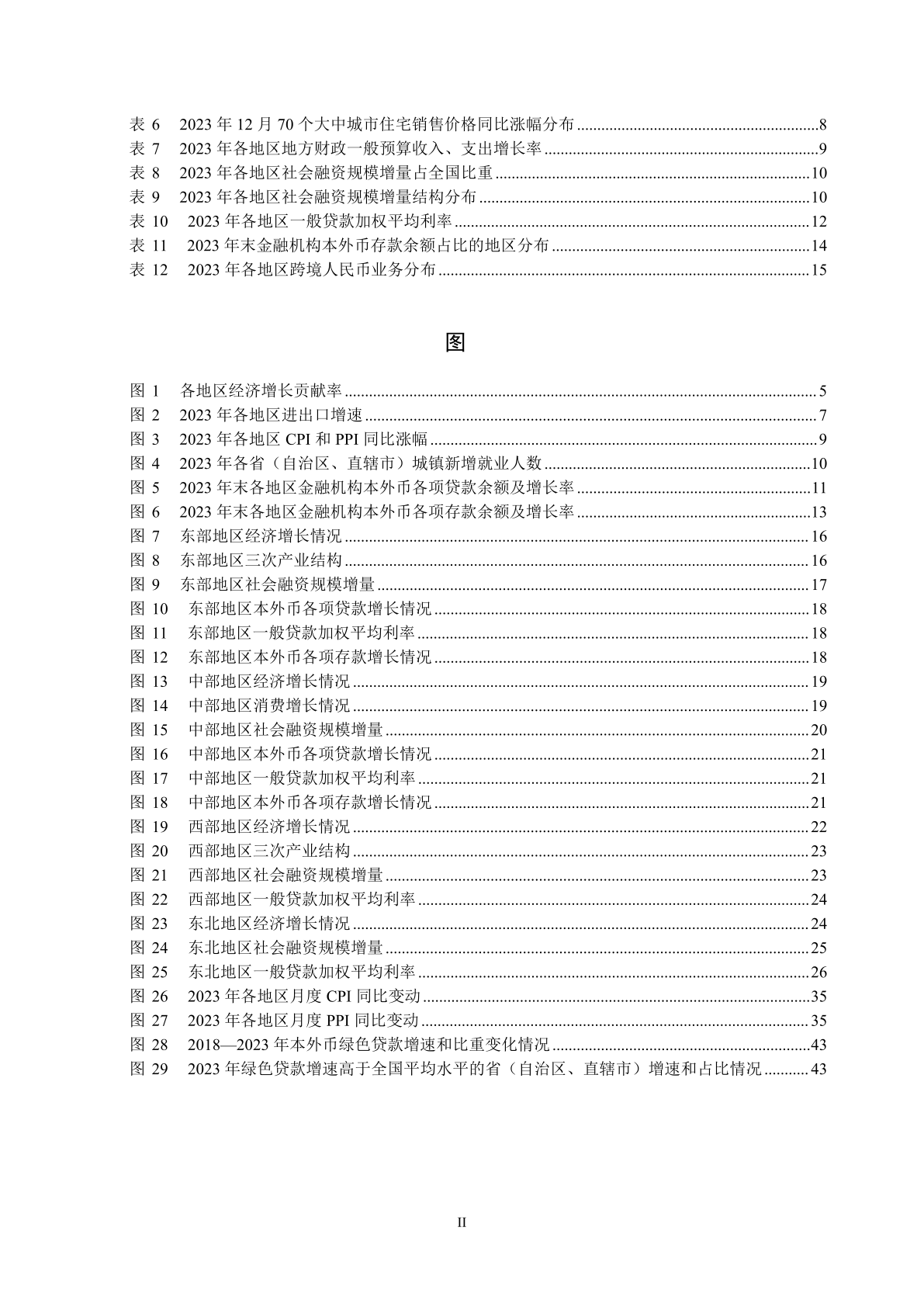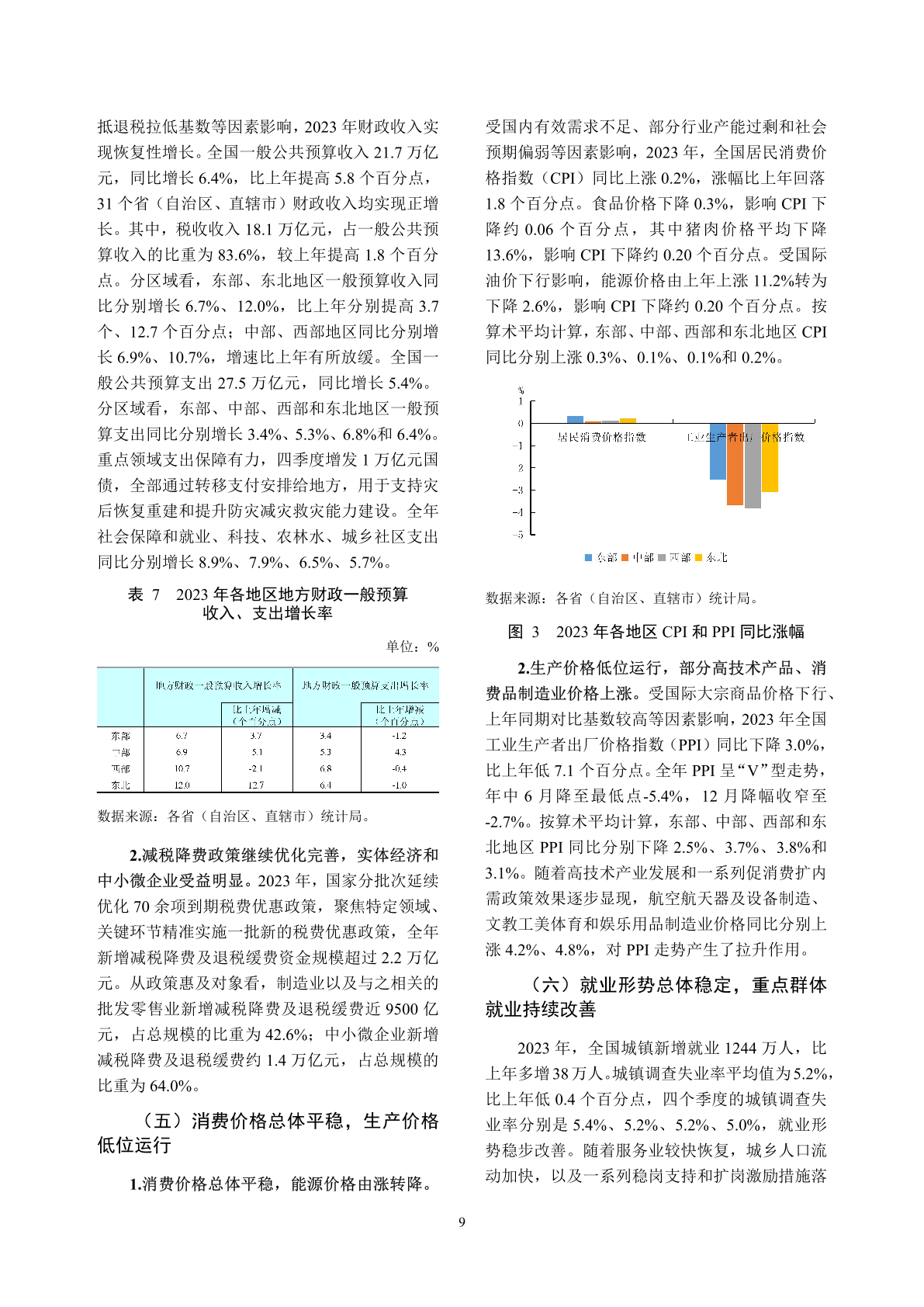 2023 年,全国国内生产总值同比增长 5.2%,增速居世界主要经济体前列,东部、中 部、西部和东北地区生产总值同比分别增长 5.4%、4.9%、5.5%和 4.8%。东部地区经济带 动作用明显。经济总量保持领先,新动能投资明显加快,现代化产业体系建设取得重要 进展;金融业运行稳健,服务质效进一步提升,金融改革创新取得新成效。中部地区经 济稳中提质。重点项目投资支撑有力,外贸新动能加速提质,产业能级持续提升,绿色 低碳转型成效明显;金融业支持实体经济有力,对先进制造业服务力度持续加大,普惠金 融、绿色金融快速发展。西部地区经济稳中向好。工业投资拉动有力,新消费市场加速 回暖,生态环境质量全面提升;社会融资规模快速增长,绿色金融创新发展成效显著,银 行资产质量保持稳定。东北地区经济较快恢复。农业现代化水平持续提升,国家粮食安 全“压舱石”地位更加稳固,消费市场加快复苏,外贸出口快速增长;金融支持重点领域 薄弱环节力度加大,实体经济融资成本不断下降,金融生态环境持续优化。