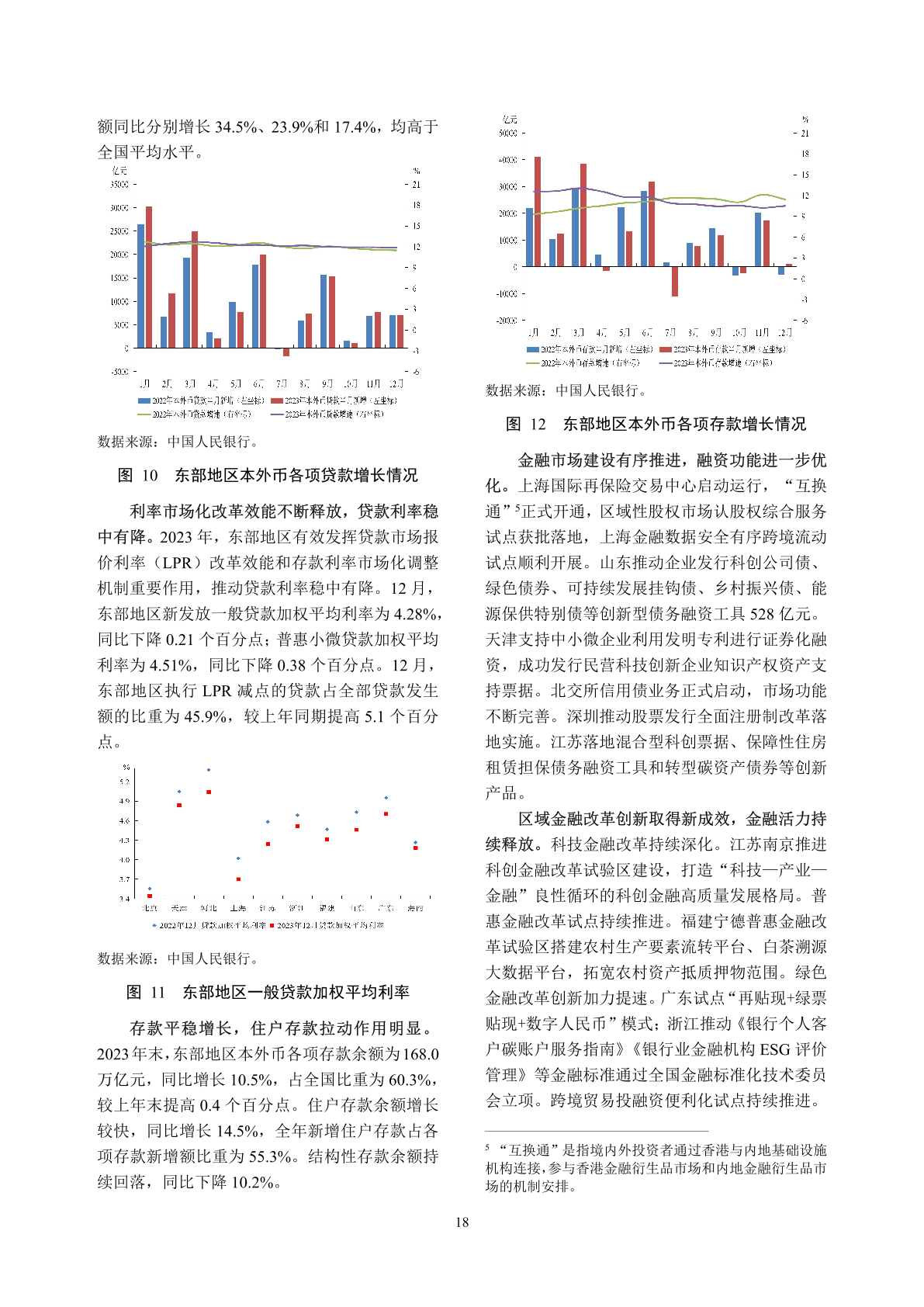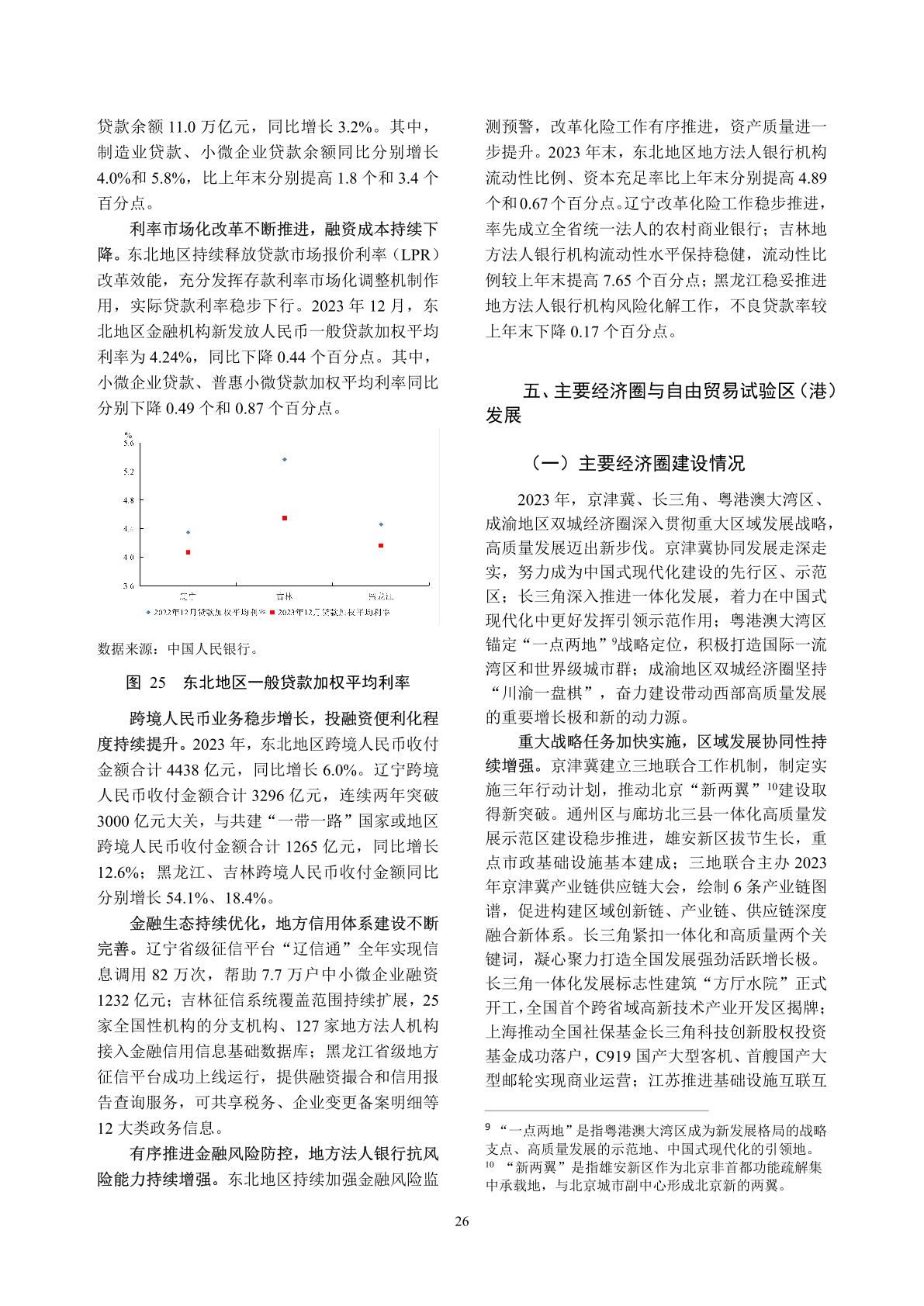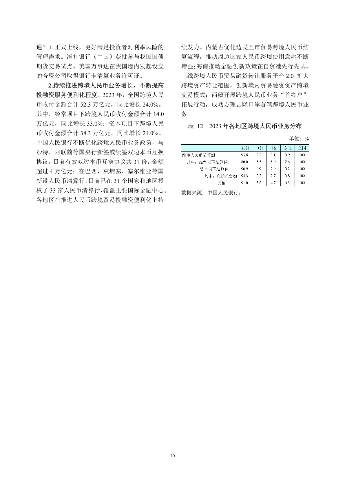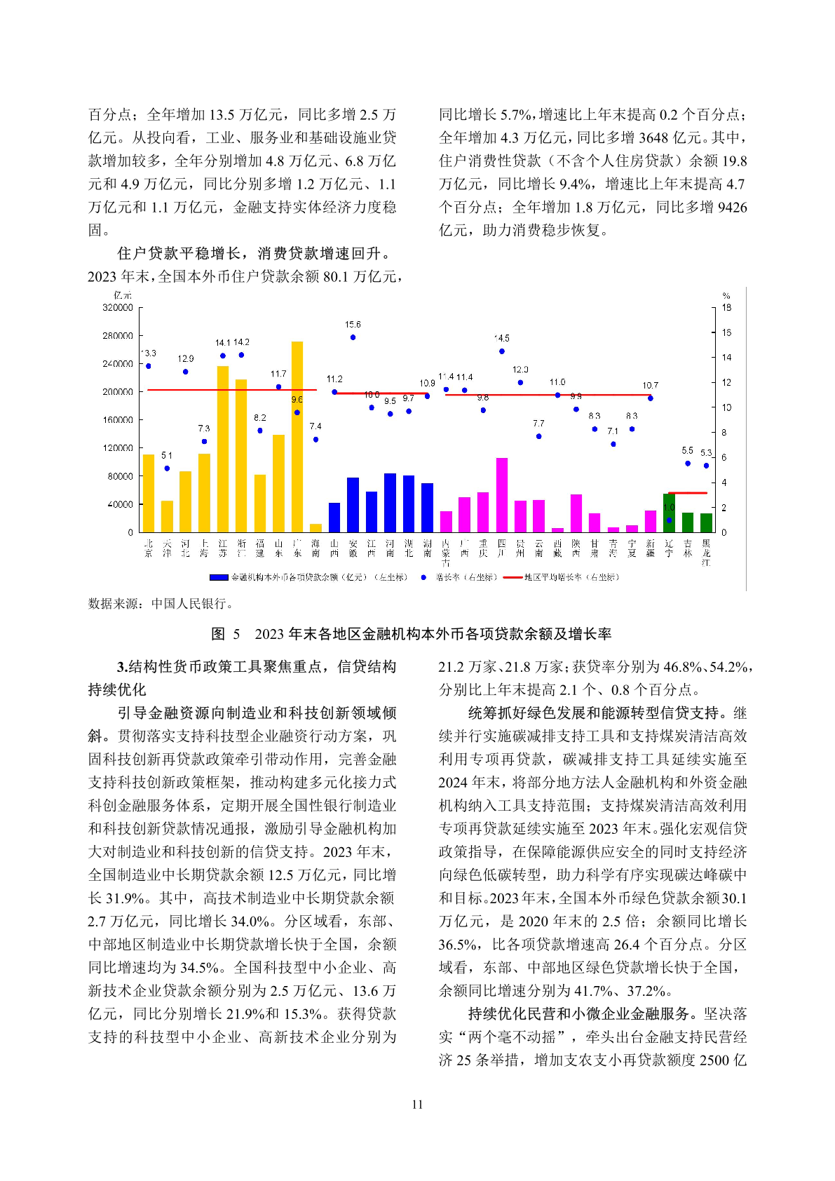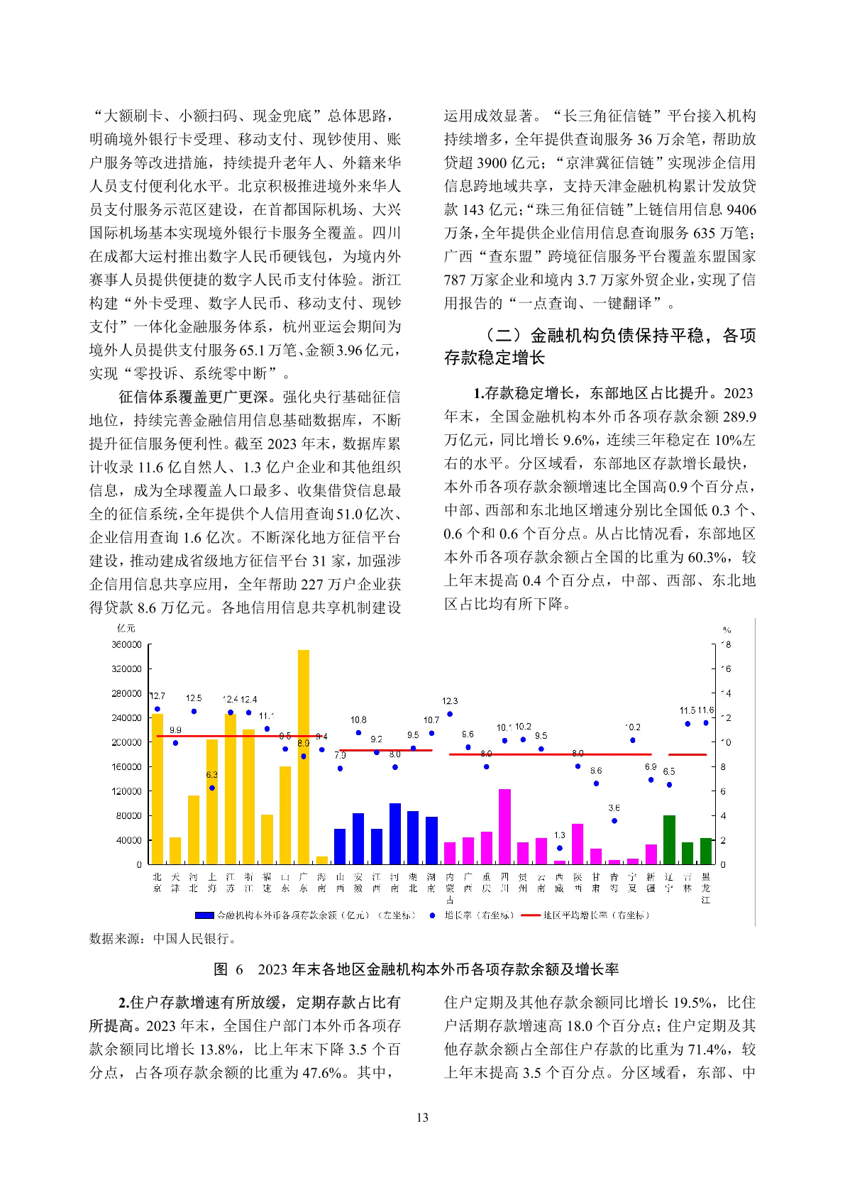 2023 年,全国国内生产总值同比增长 5.2%,增速居世界主要经济体前列,东部、中 部、西部和东北地区生产总值同比分别增长 5.4%、4.9%、5.5%和 4.8%。东部地区经济带 动作用明显。经济总量保持领先,新动能投资明显加快,现代化产业体系建设取得重要 进展;金融业运行稳健,服务质效进一步提升,金融改革创新取得新成效。中部地区经 济稳中提质。重点项目投资支撑有力,外贸新动能加速提质,产业能级持续提升,绿色 低碳转型成效明显;金融业支持实体经济有力,对先进制造业服务力度持续加大,普惠金 融、绿色金融快速发展。西部地区经济稳中向好。工业投资拉动有力,新消费市场加速 回暖,生态环境质量全面提升;社会融资规模快速增长,绿色金融创新发展成效显著,银 行资产质量保持稳定。东北地区经济较快恢复。农业现代化水平持续提升,国家粮食安 全“压舱石”地位更加稳固,消费市场加快复苏,外贸出口快速增长;金融支持重点领域 薄弱环节力度加大,实体经济融资成本不断下降,金融生态环境持续优化。