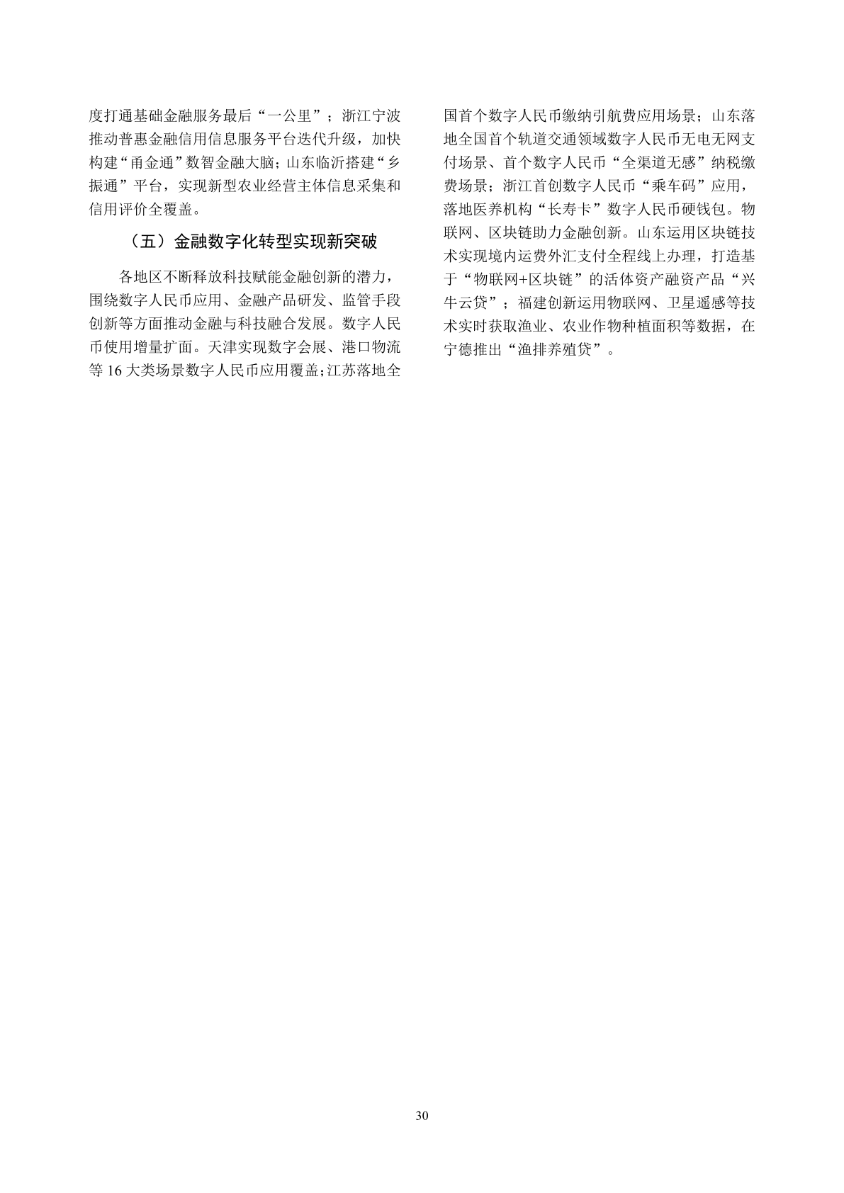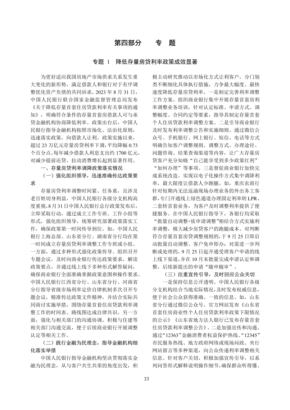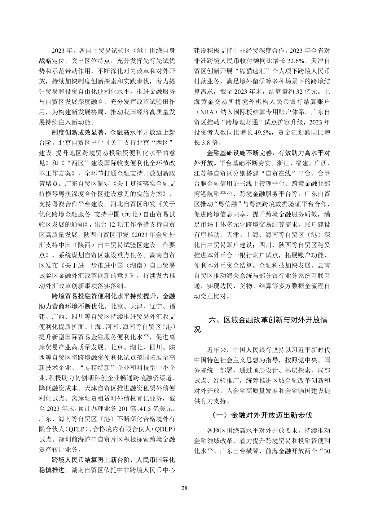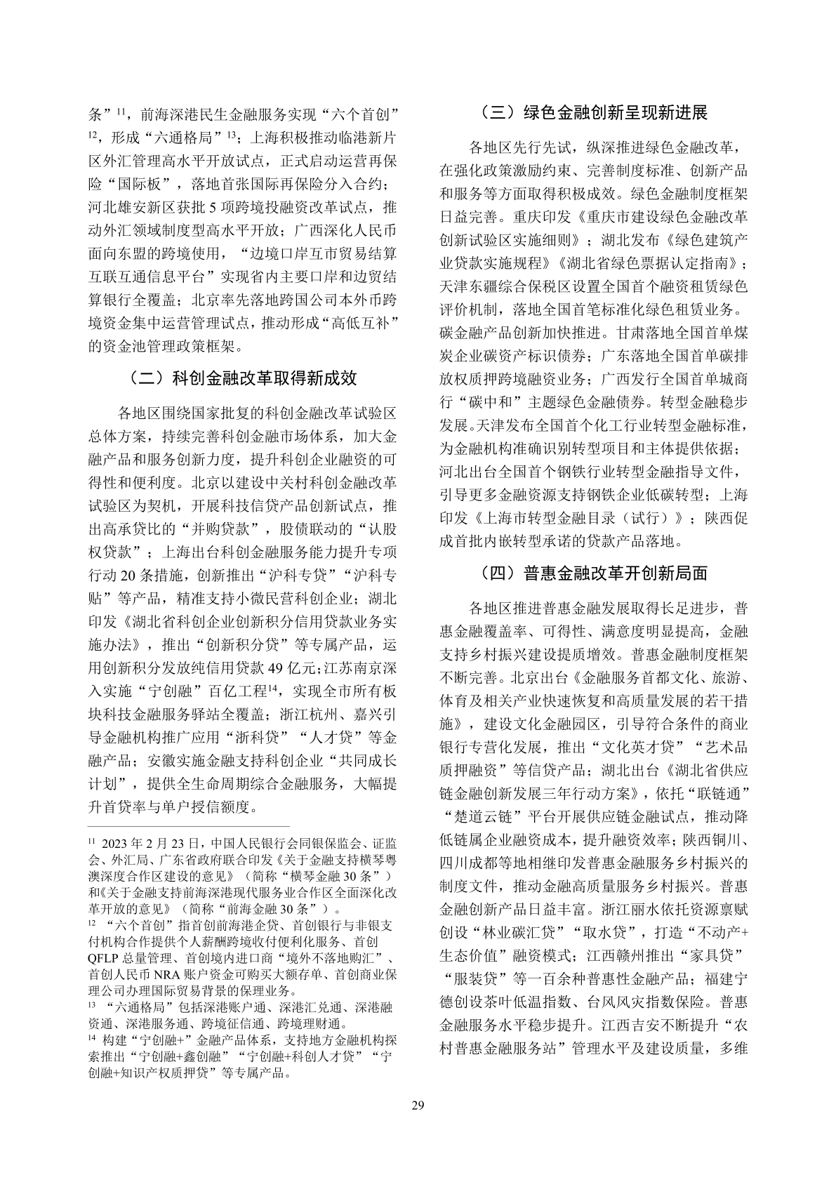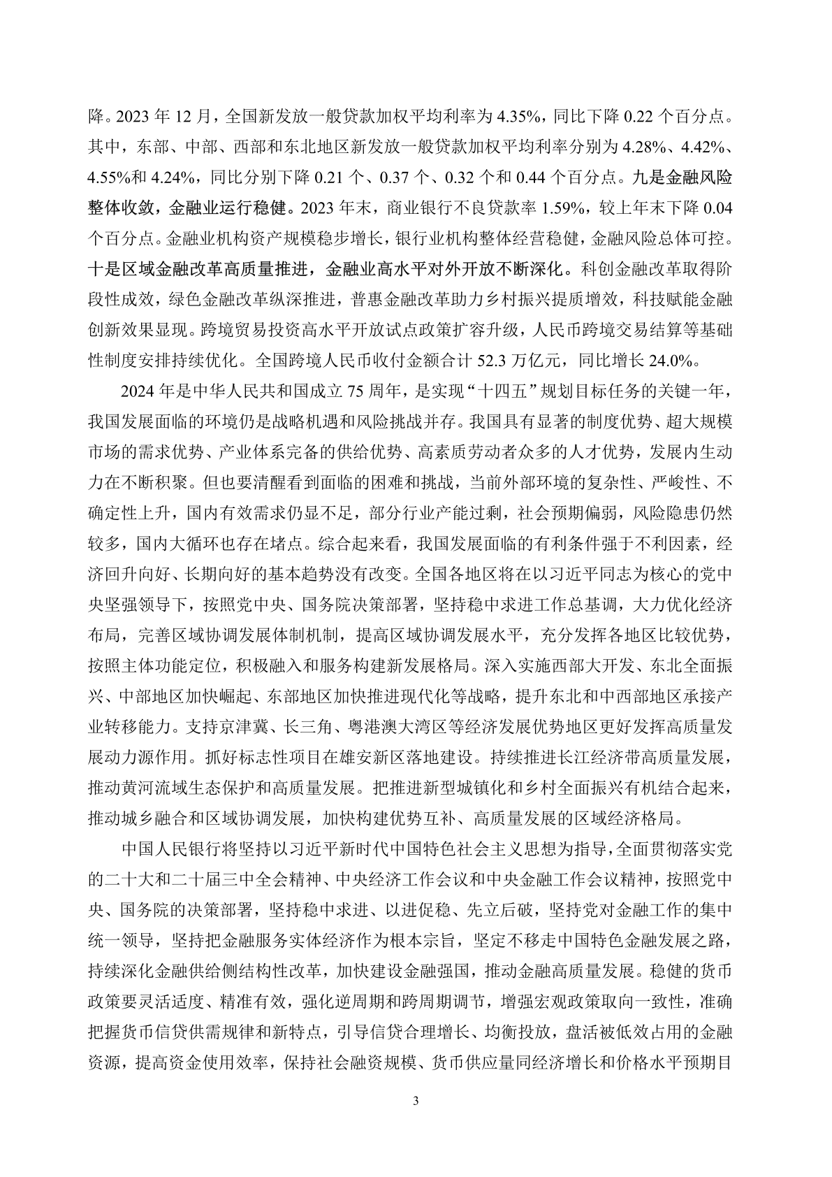 2023 年,全国国内生产总值同比增长 5.2%,增速居世界主要经济体前列,东部、中 部、西部和东北地区生产总值同比分别增长 5.4%、4.9%、5.5%和 4.8%。东部地区经济带 动作用明显。经济总量保持领先,新动能投资明显加快,现代化产业体系建设取得重要 进展;金融业运行稳健,服务质效进一步提升,金融改革创新取得新成效。中部地区经 济稳中提质。重点项目投资支撑有力,外贸新动能加速提质,产业能级持续提升,绿色 低碳转型成效明显;金融业支持实体经济有力,对先进制造业服务力度持续加大,普惠金 融、绿色金融快速发展。西部地区经济稳中向好。工业投资拉动有力,新消费市场加速 回暖,生态环境质量全面提升;社会融资规模快速增长,绿色金融创新发展成效显著,银 行资产质量保持稳定。东北地区经济较快恢复。农业现代化水平持续提升,国家粮食安 全“压舱石”地位更加稳固,消费市场加快复苏,外贸出口快速增长;金融支持重点领域 薄弱环节力度加大,实体经济融资成本不断下降,金融生态环境持续优化。