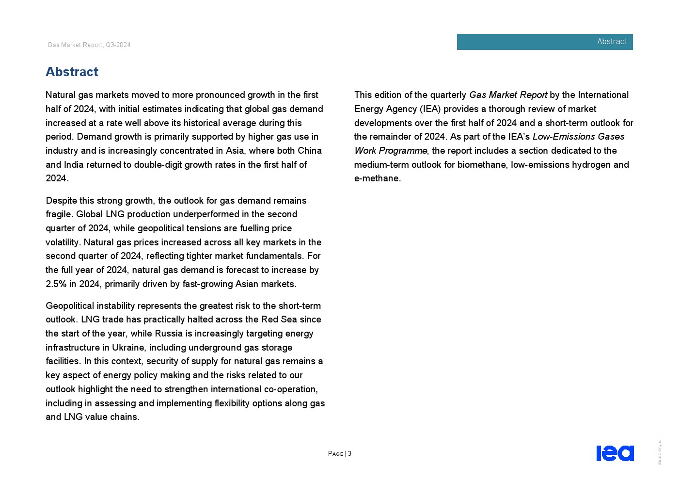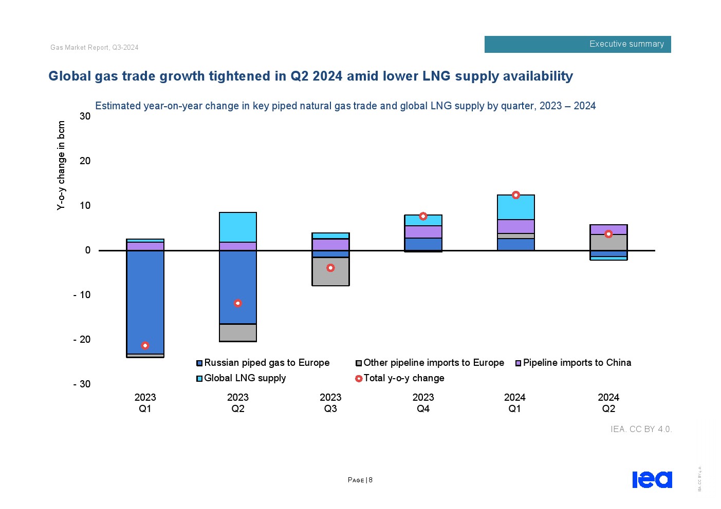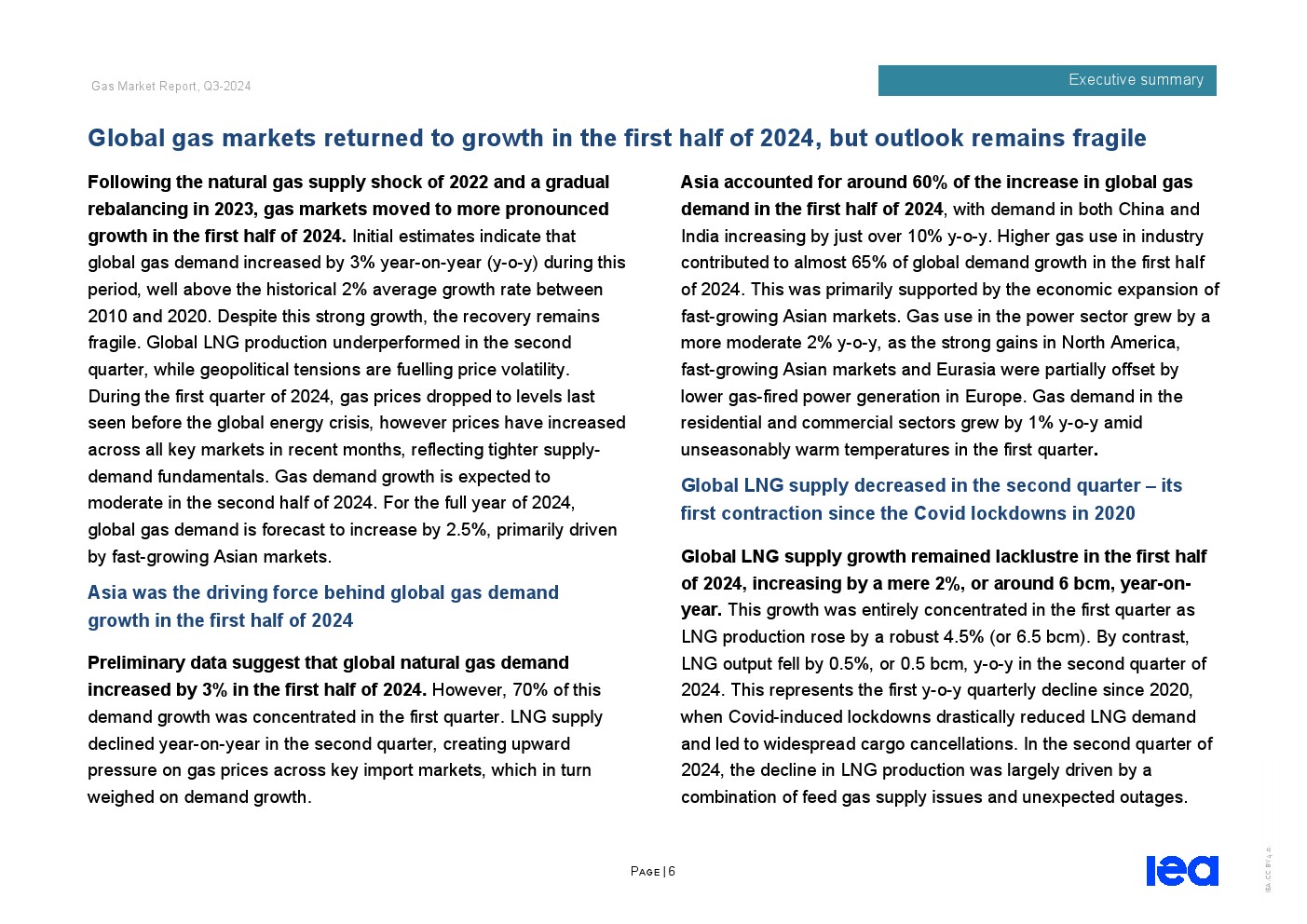 初步数据显示,2024年上半年全球天然气需求增长了3%。
