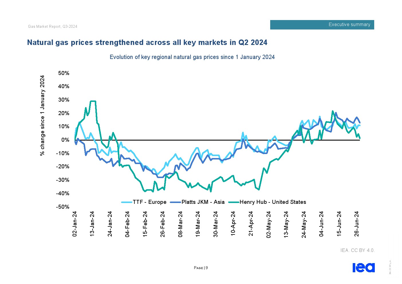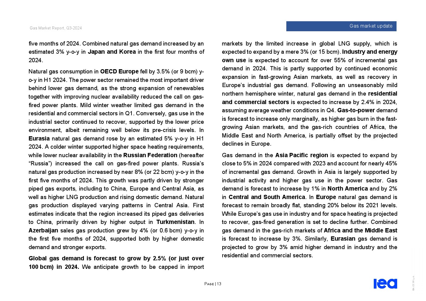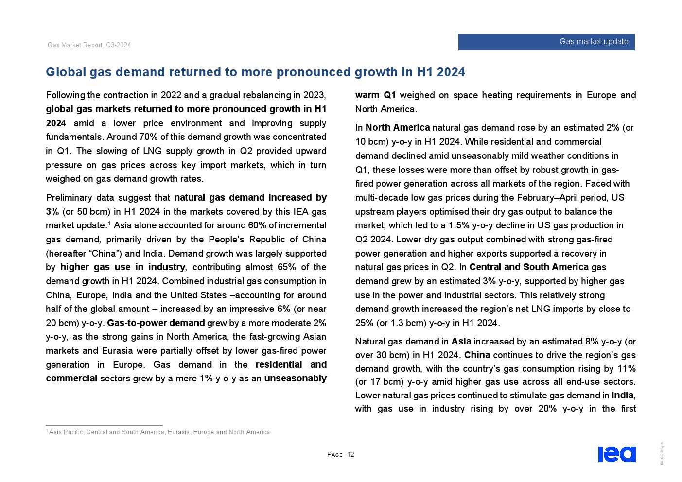 初步数据显示,2024年上半年全球天然气需求增长了3%。