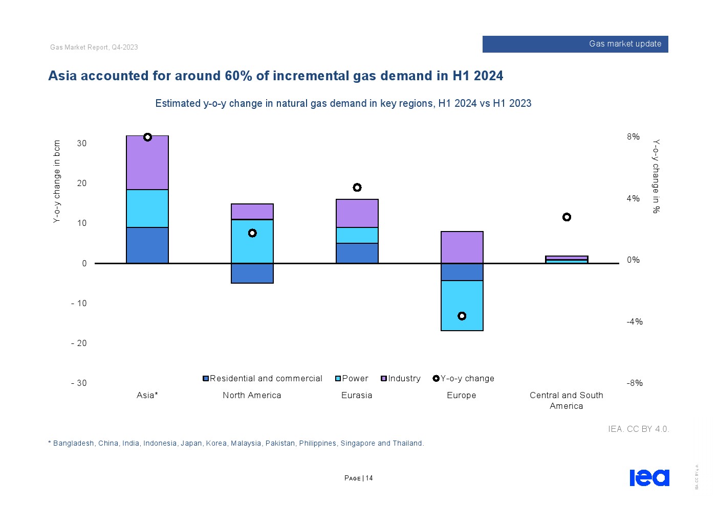2024年上半年,亚洲约占全球天然气需求增长的60%,其中中国和印度的需求同比增长略高于10%。