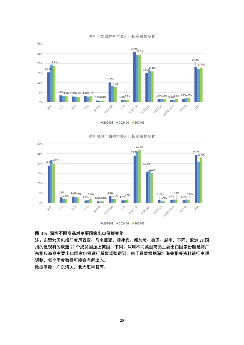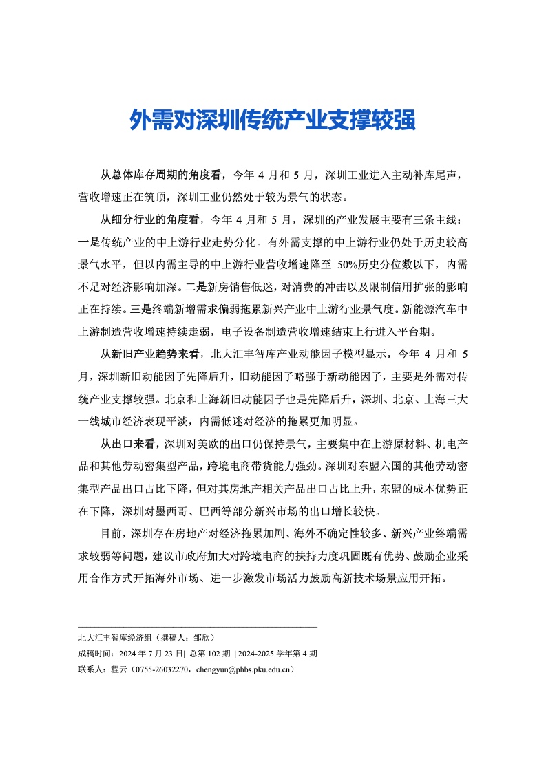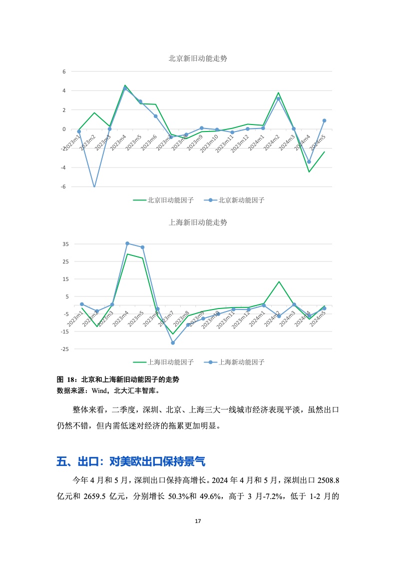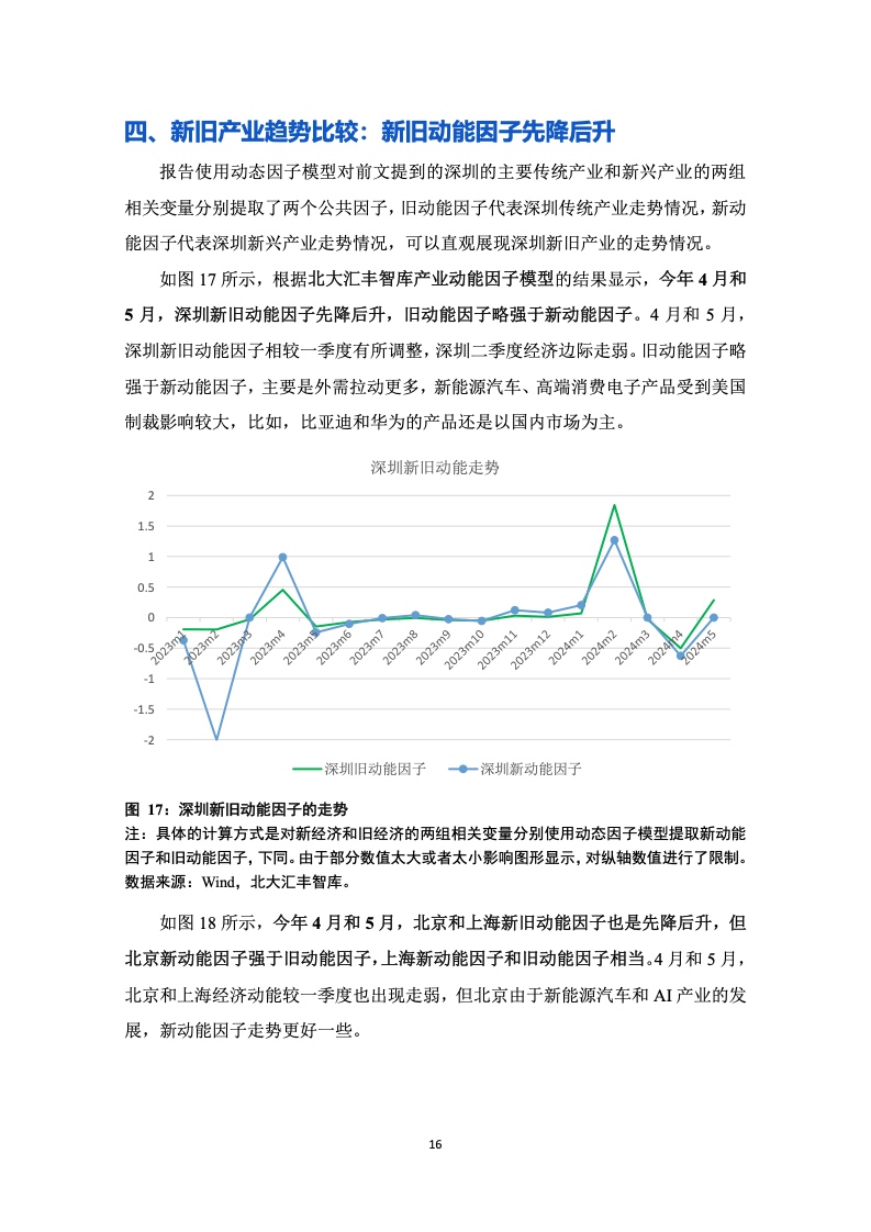 从新旧产业趋势来看,北大汇丰智库产业动能因子模型显示,今年 4 月和 5月,深圳新旧动能因子先降后升,旧动能因子略强于新动能因子,主要是外需对传统产业支撑较强。北京和上海新旧动能因子也是先降后升,深圳、北京、上海三大一线城市经济表现平淡,内需低迷对经济的拖累更加明显。