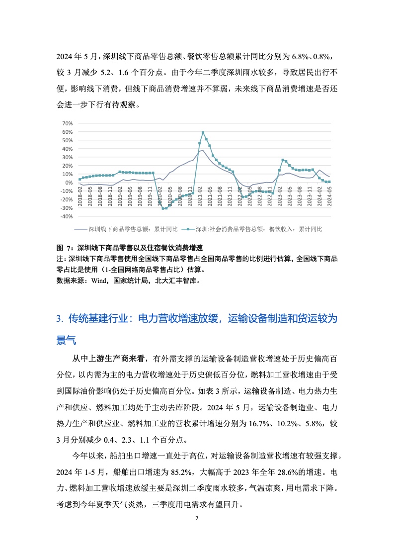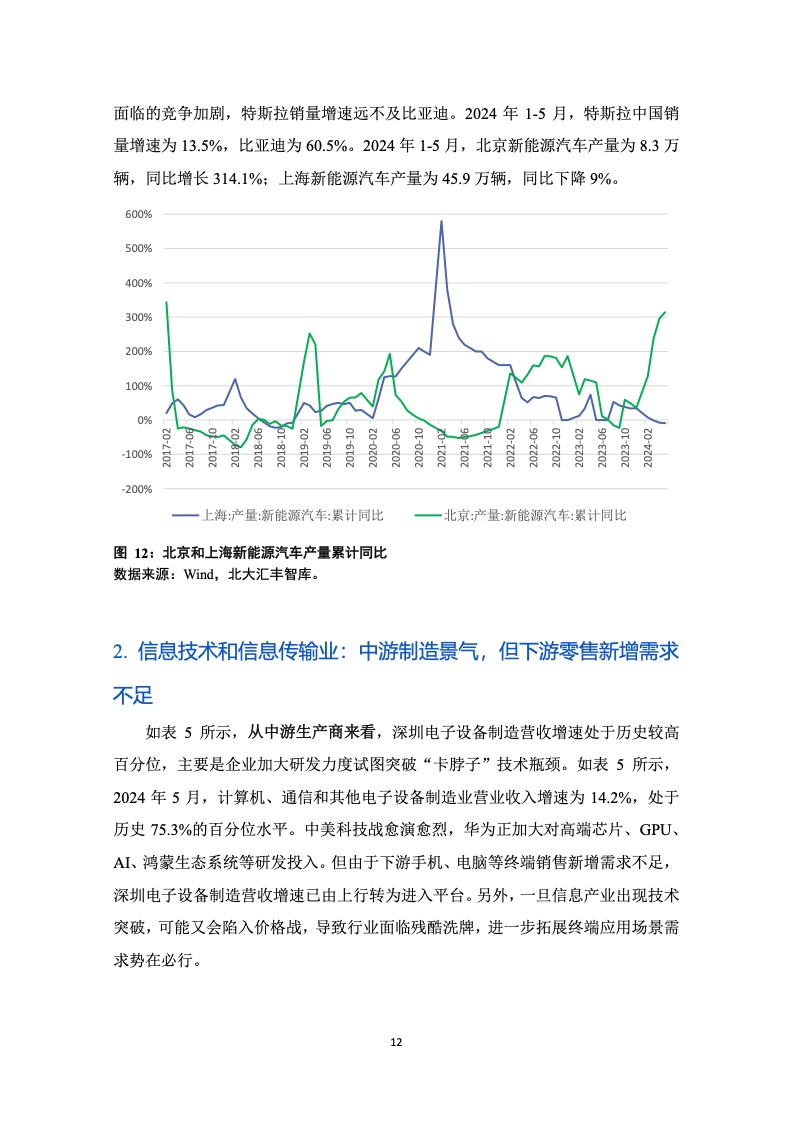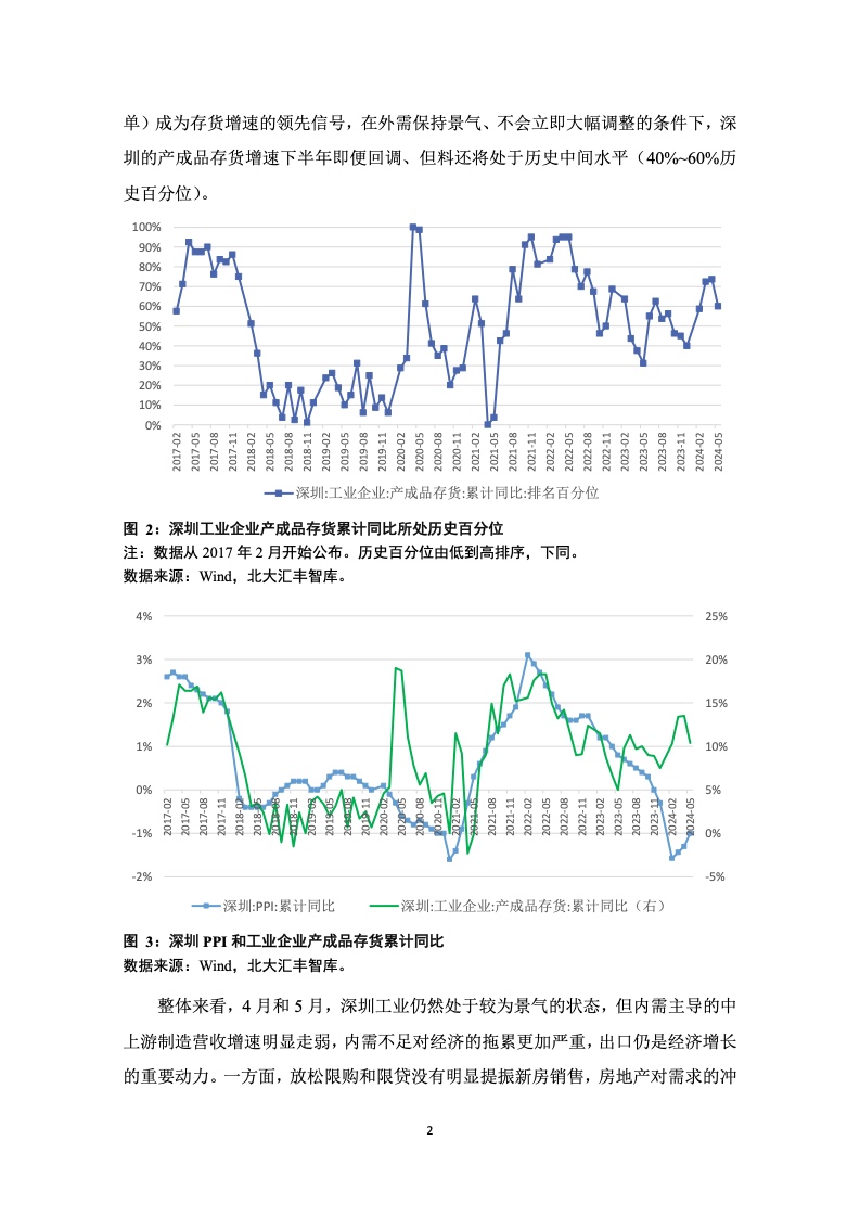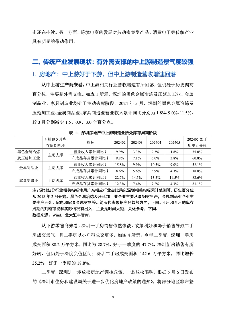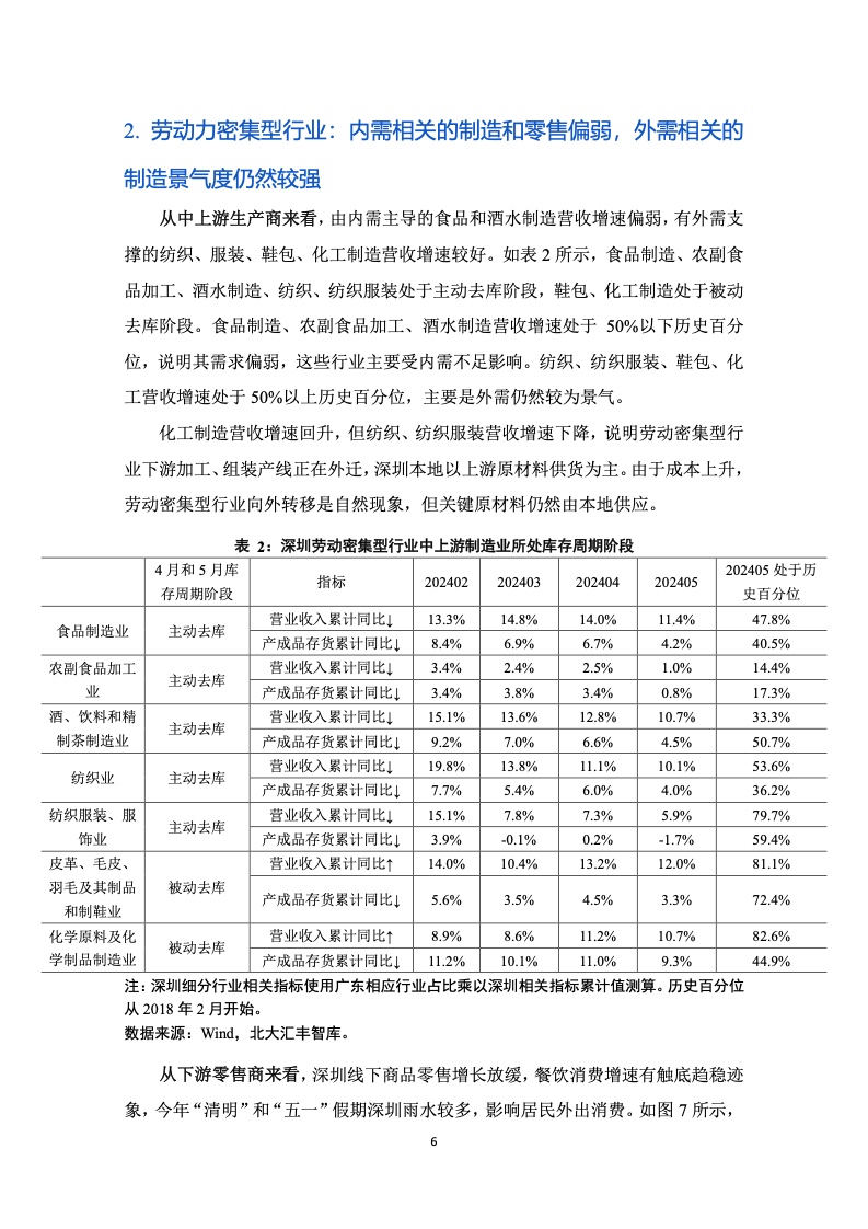 从细分行业的角度看,今年 4 月和 5 月,深圳的产业发展主要有三条主线:一是传统产业的中上游行业走势分化。有外需支撑的中上游行业仍处于历史较高景气水平,但以内需主导的中上游行业营收增速降至 50%历史分位数以下,内需不足对经济影响加深。二是新房销售低迷,对消费的冲击以及限制信用扩张的影响