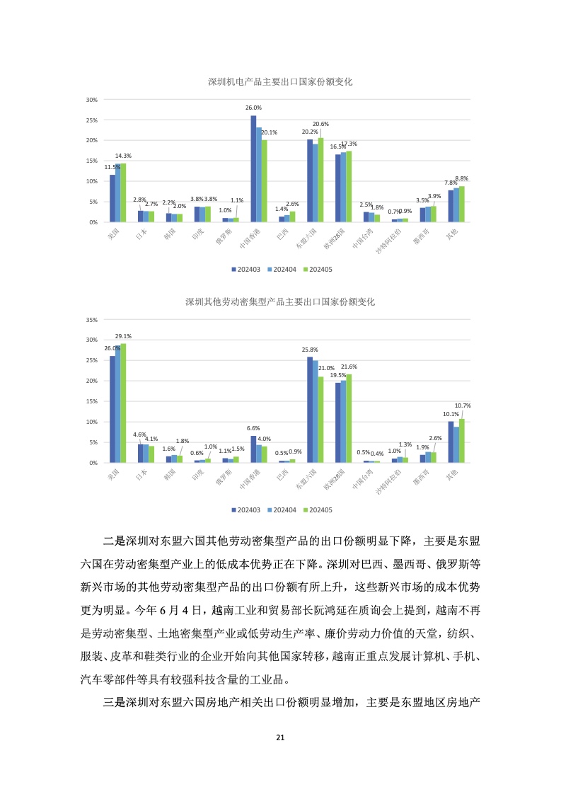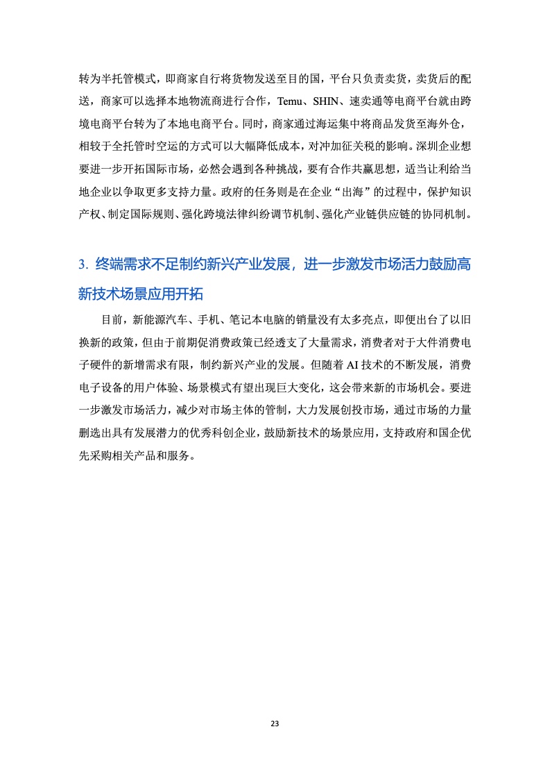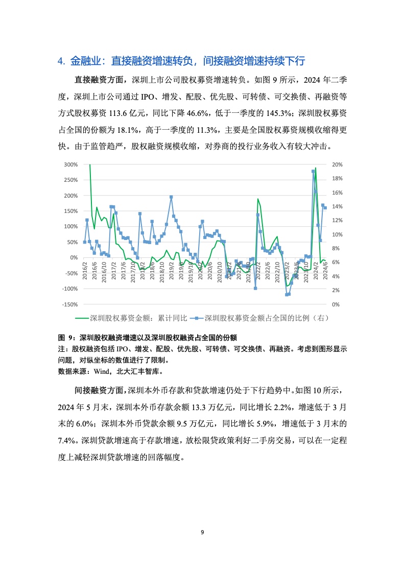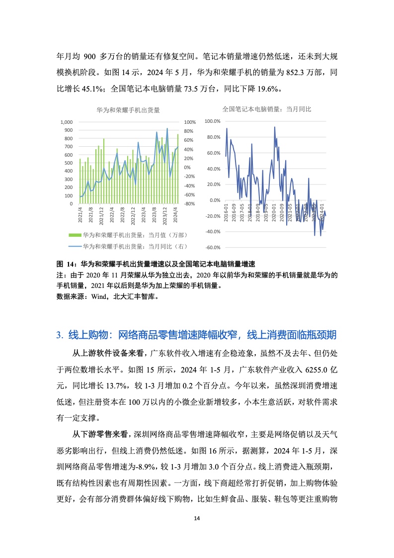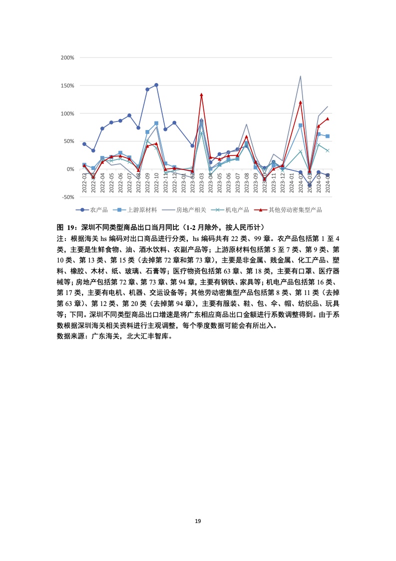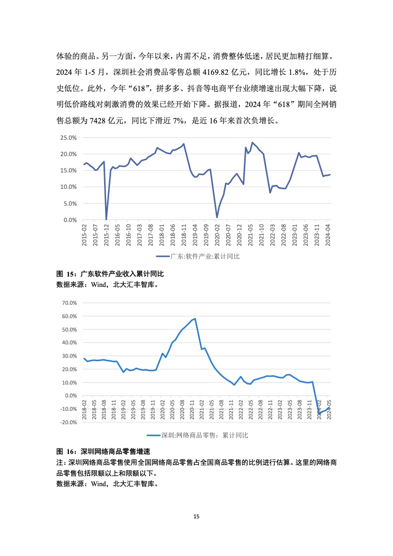 从细分行业的角度看,今年 4 月和 5 月,深圳的产业发展主要有三条主线:一是传统产业的中上游行业走势分化。有外需支撑的中上游行业仍处于历史较高景气水平,但以内需主导的中上游行业营收增速降至 50%历史分位数以下,内需不足对经济影响加深。二是新房销售低迷,对消费的冲击以及限制信用扩张的影响