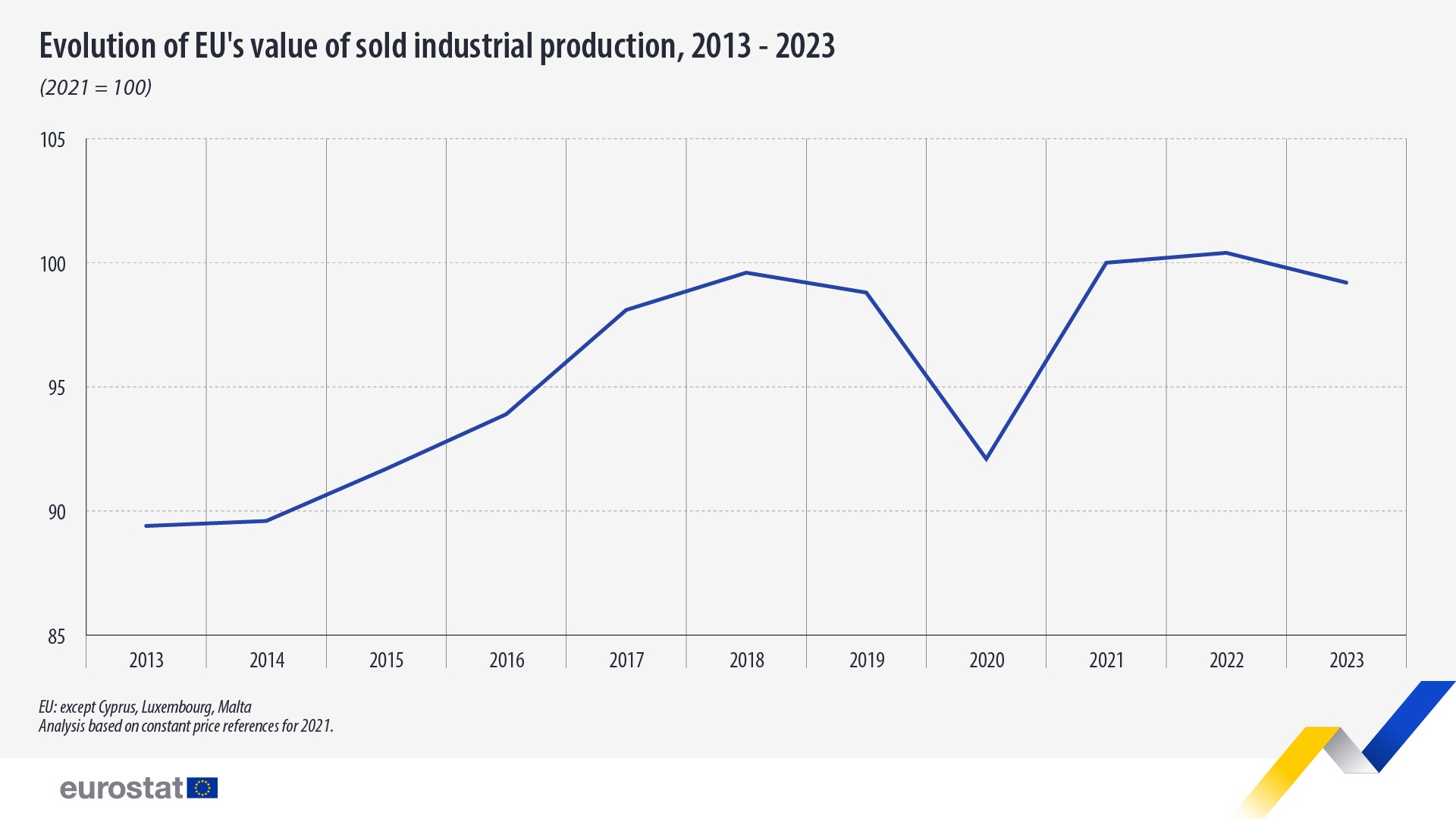 经过连续两次增长(2021年比2020年增长8.5%,2022年比2021年增长0.4%),欧盟制成品产量在2023年同比下降了1.2%。