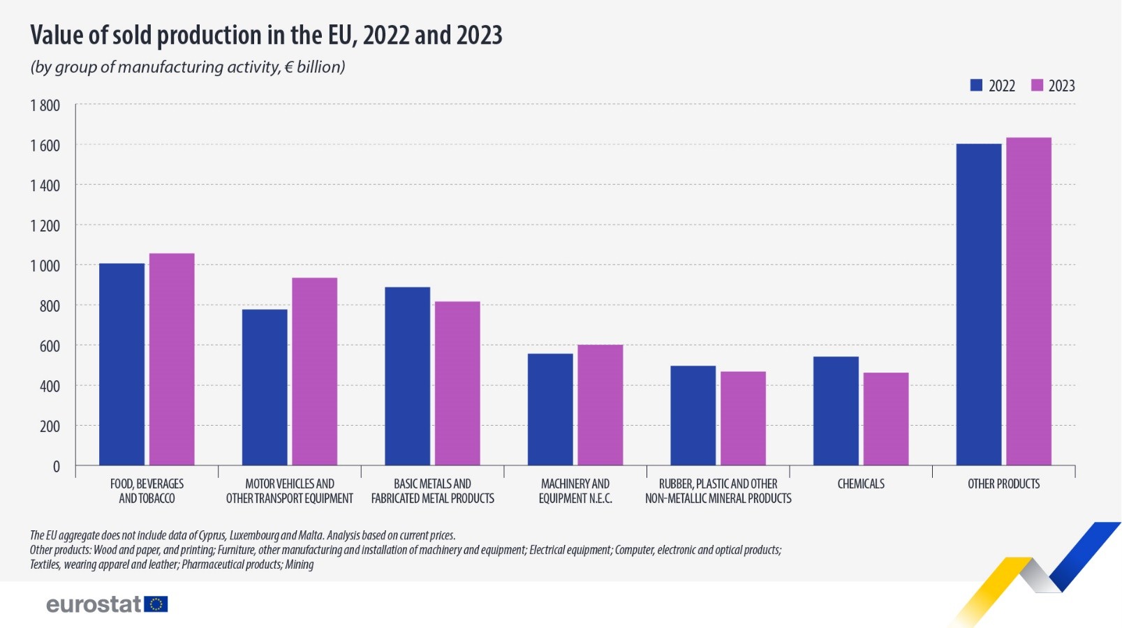 在2013年和2014年略有下降之后,欧盟的产量逐渐增加,直到2018年。2019年,销售产品的价值出现小幅下降,然后由于大流行的影响,2020年下降幅度更大。大流行和欧盟国家广泛采取的相关遏制措施对2020年欧盟工业生产产生了重大影响,但2021年和2022年,所有工业活动类别的生产都有所增加。