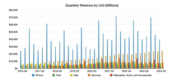 由于本季度推出了M4 iPad Pro和M2 iPad Air ,苹果的iPad销量迎来了一轮大幅增长,iPad营收为72亿美元,较去年同期的58亿美元增长24%,iPhone营收下降1%(393亿美元),Mac营收增长2%(70亿美元),家居、配件和可穿戴设备营收下降2%(81 亿美元)。