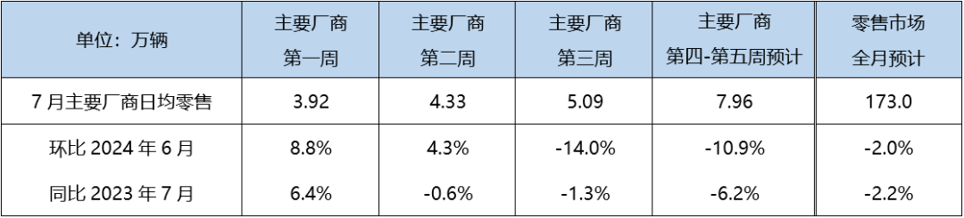 7月第1周为完整周,日均零售3.92万辆,同比6.4%,环比8.8%,主要是去年同期受6月底政策退坡透支带来的低基数影响。第2周日均零售4.33万辆,同比-0.6%,环比4.3%。第3周豪华品牌宣布退出价格战之后,消费者信心得以稳定,车市热度温和维持,但与去年同期政策拉动下的高基数相比仍有一定距离,同比-1.3%,环比-14.0%。第4周至第5周车市温和维持当前车市热度,预计日均零售7.96万辆,同比-6.2%,环比-10.9%,综合估算7月零售可达到173万辆左右。
