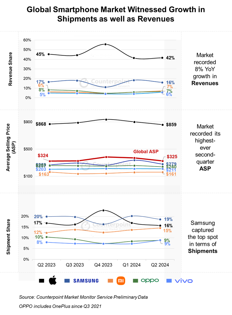 Counterpoint的最新研究显示,2024年第二季度全球智能手机出货量同比增长8%。由于消费者信心和宏观经济状况的改善,几乎所有地区都实现了增长。这标志着全球智能手机市场连续第三个季度实现增长。