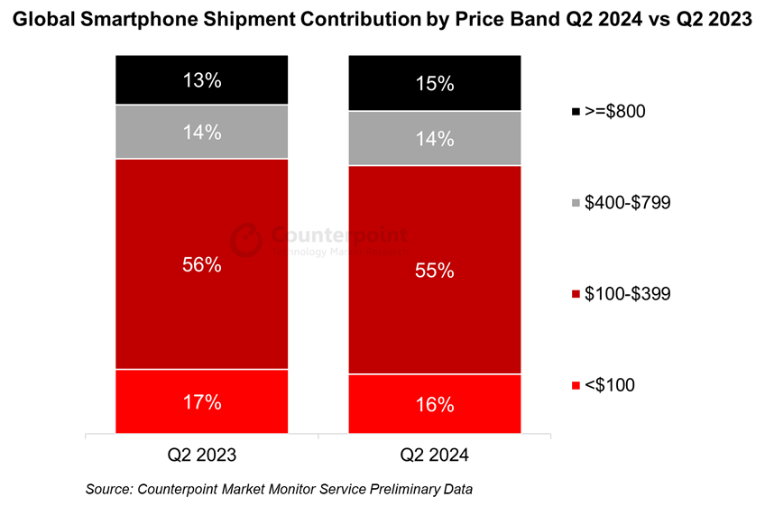 全球智能手机收入在2024年第二季度也同比增长了8%。苹果以42%的市场份额领跑智能手机市场。由于平均售价和出货量的增长,三星的收入同比增长5%。在排名前五的原始设备制造商中,小米的收入增长连续第二个季度最快,因为它在关键市场保持了强劲的表现。800美元以上的分支市场的份额继续增长,同比增长2%,而400美元以下的分支市场的份额也在提高。