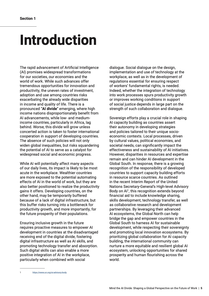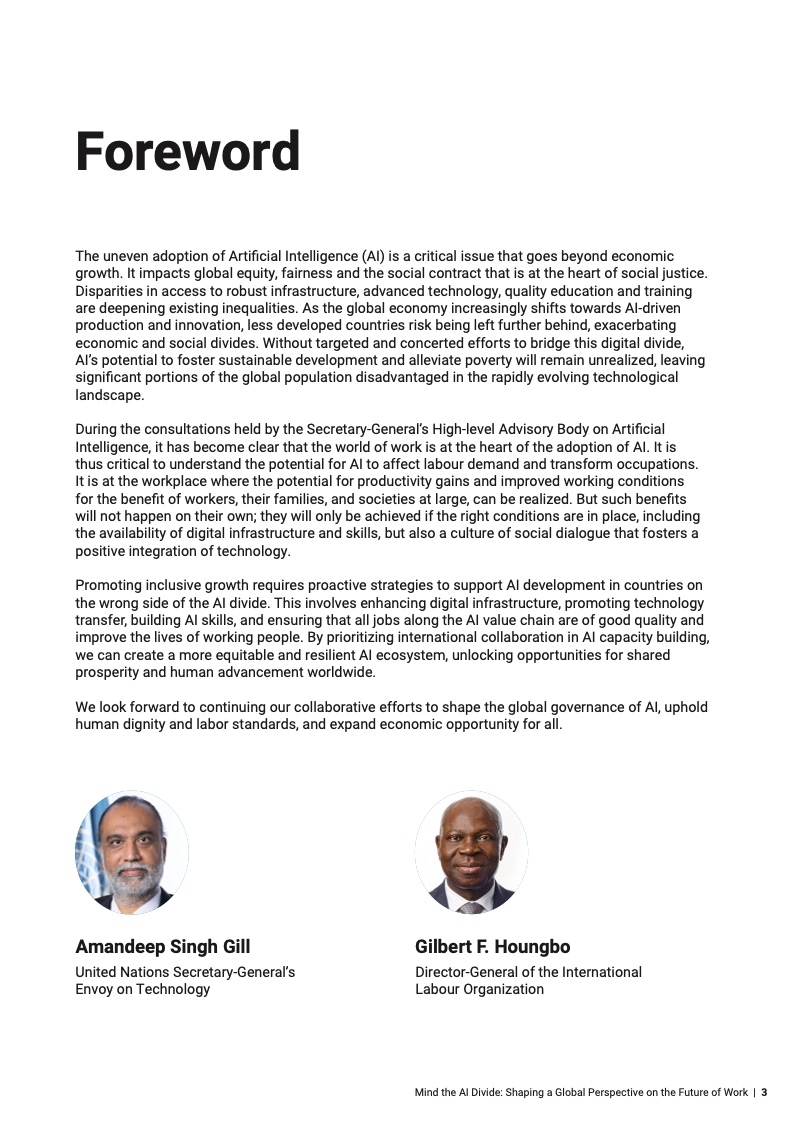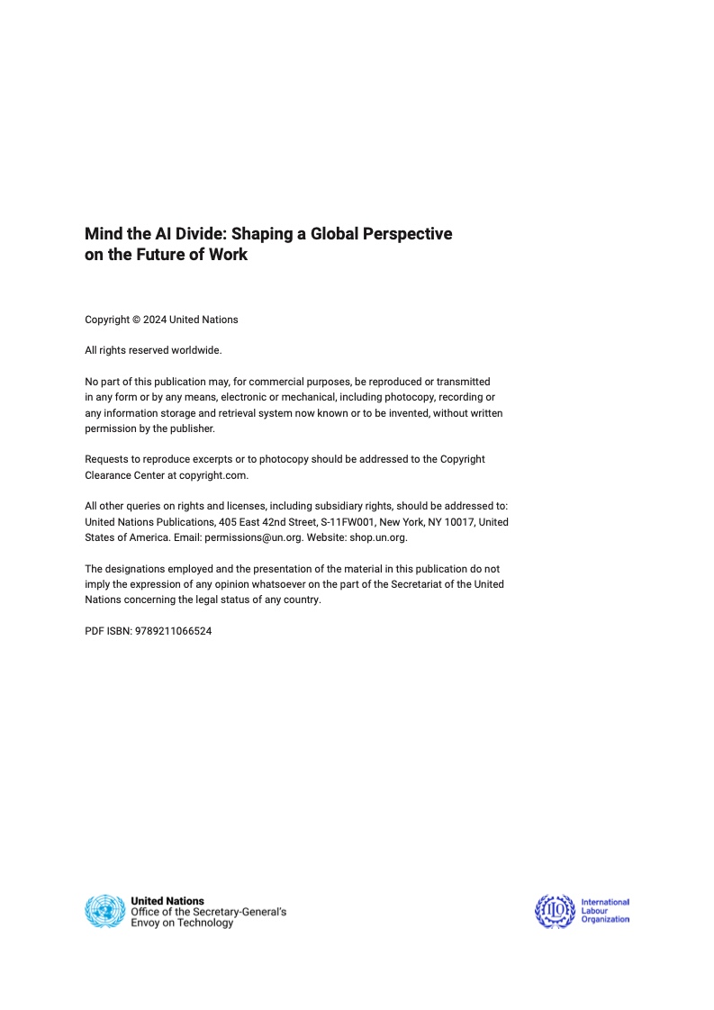由联合国和国际劳工组织共同发布的报告《关注AI鸿沟:塑造未来劳动世界的全球视角》探讨了AI应用不均衡这一关键问题,及其对全球社会正义的影响。